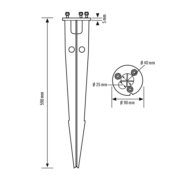For forenklet montering av pullertlampene i ALVA Ø 100 mm. Stabil stålutførelse, varmeforsinket slik at det kan settes i betongfundament eller graves ned i bakken. Skruer i rustfritt stål og underlagsskiver følger med i leveransen. To rør med en maksimal diameter på 25 mm kan føres gjennom åpningene på toppen av jordspydet for tilkoblingskablene..