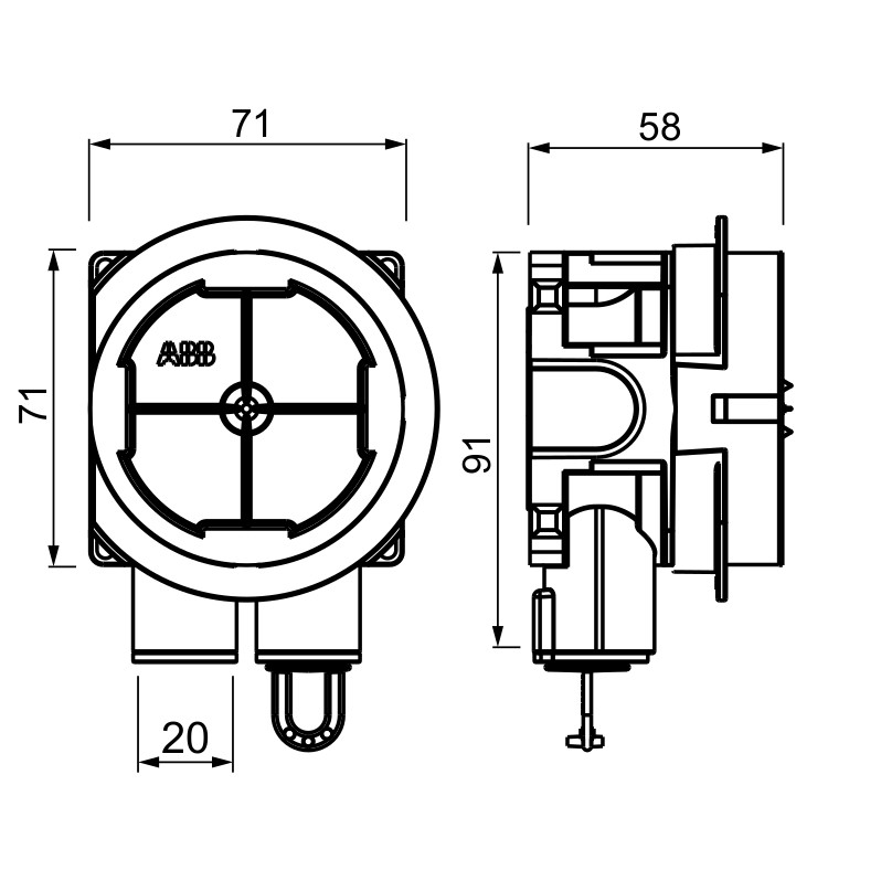 Boksen har to faste rørinnfestninger, begge er åpne (det en er forseglet med plugg) og begge rørinnfestningene er utstyrt med en låseanordning i metall for pålitelig forbindelse mellom rør og boks. Både fleksible og stive plastrør kan festes til rørinnfestningene, og begge har 16/20 mm røradaptere.