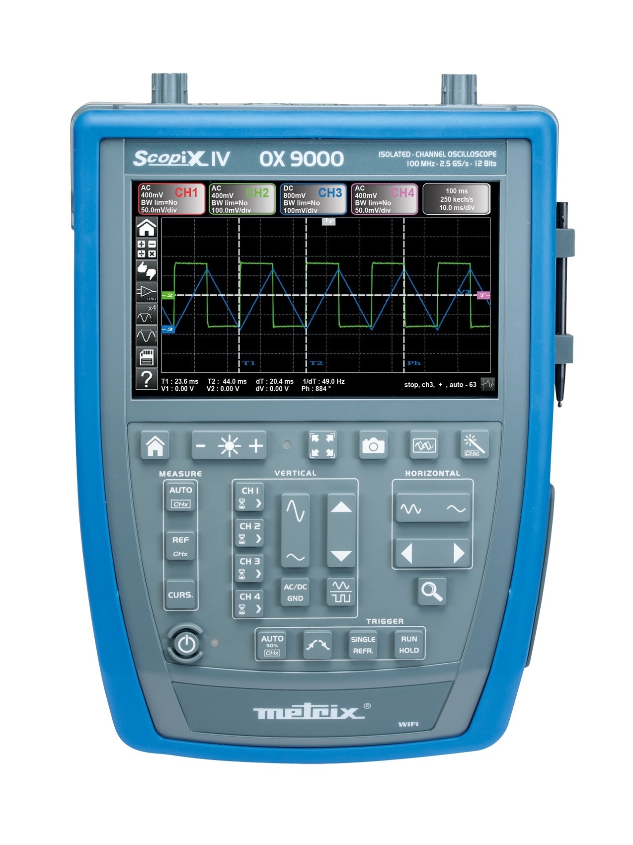 Med probix tilbehør oppnås automatisk skaleringsfunksjon. Ved benyttelse av strømtang kan 1- og 3 faset aktiv, reaktiv og tilsynelatende effekt og effektfaktor måles i høy oppløsning. Scopix IV er 4 instrumenter i ét. Oscilloskop, multimeter, logger og harmonisk analysator.