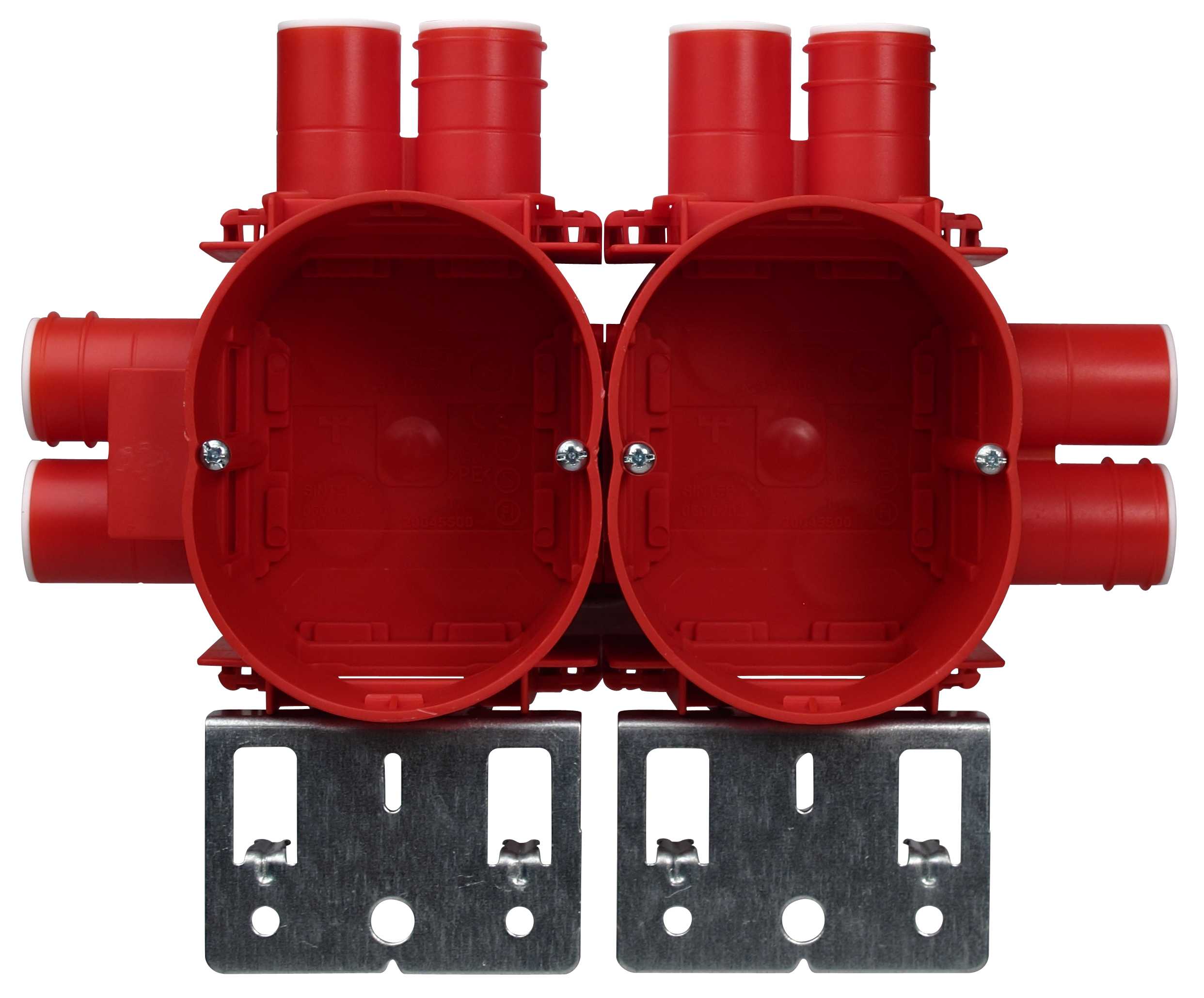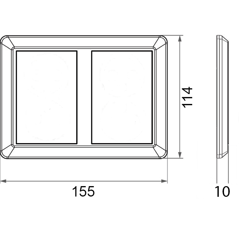 2 hulls ELKO RS16 dobbelstikkontaktramme, kompletteres med doble stikkontakter for enkel- eller 1,5 veggboks, el.nr. 15 118 61. Veggbokser monteres med korte skjøtestykker for riktig avstand.