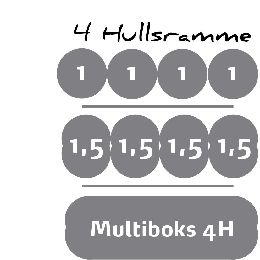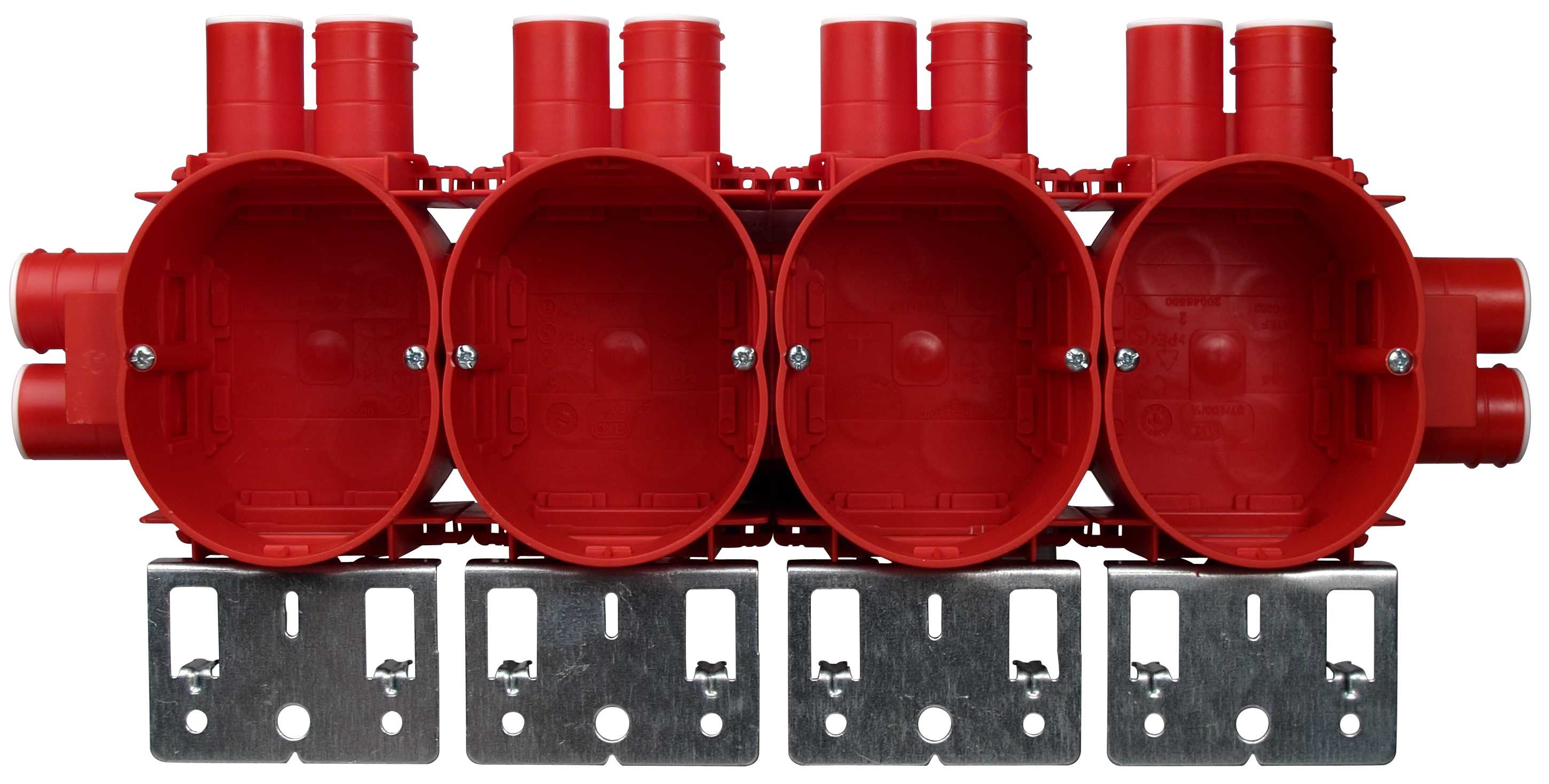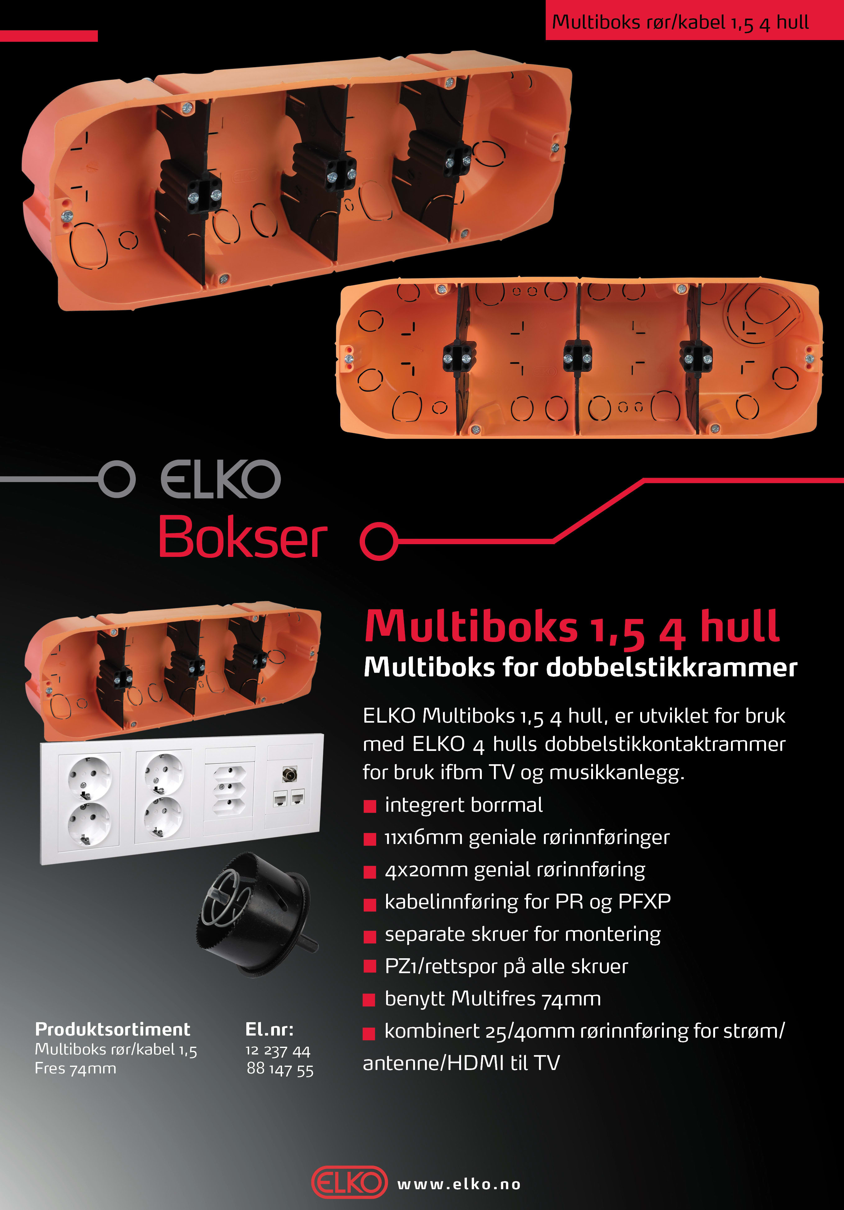 4 hulls ELKO RS16 dobbelstikkontaktramme, kompletteres med doble stikkontakter for enkel- eller 1,5 veggboks, el.nr. 15 118 61. Veggbokser monteres med korte skjøtestykker for riktig avstand. ELKO Multiboks 4x1,5 el.nr: 12 237 44 kan enkelt benyttes.