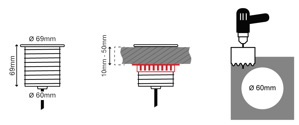 Borduttak leveres som USB-A med stikkontakt. Borduttaket felles ned i f.eks kjøkkenbenk, skrivebord eller andre flater der det er ønske om borduttak. Leveres med transparent støvlokk. Hulltaking med 60mm fres. Bordladerne leveres ferdig terminert med 2 meter kabel og plugg for tilkobling i stikkontakt. Ladekapasitet: 5V / 3,1A