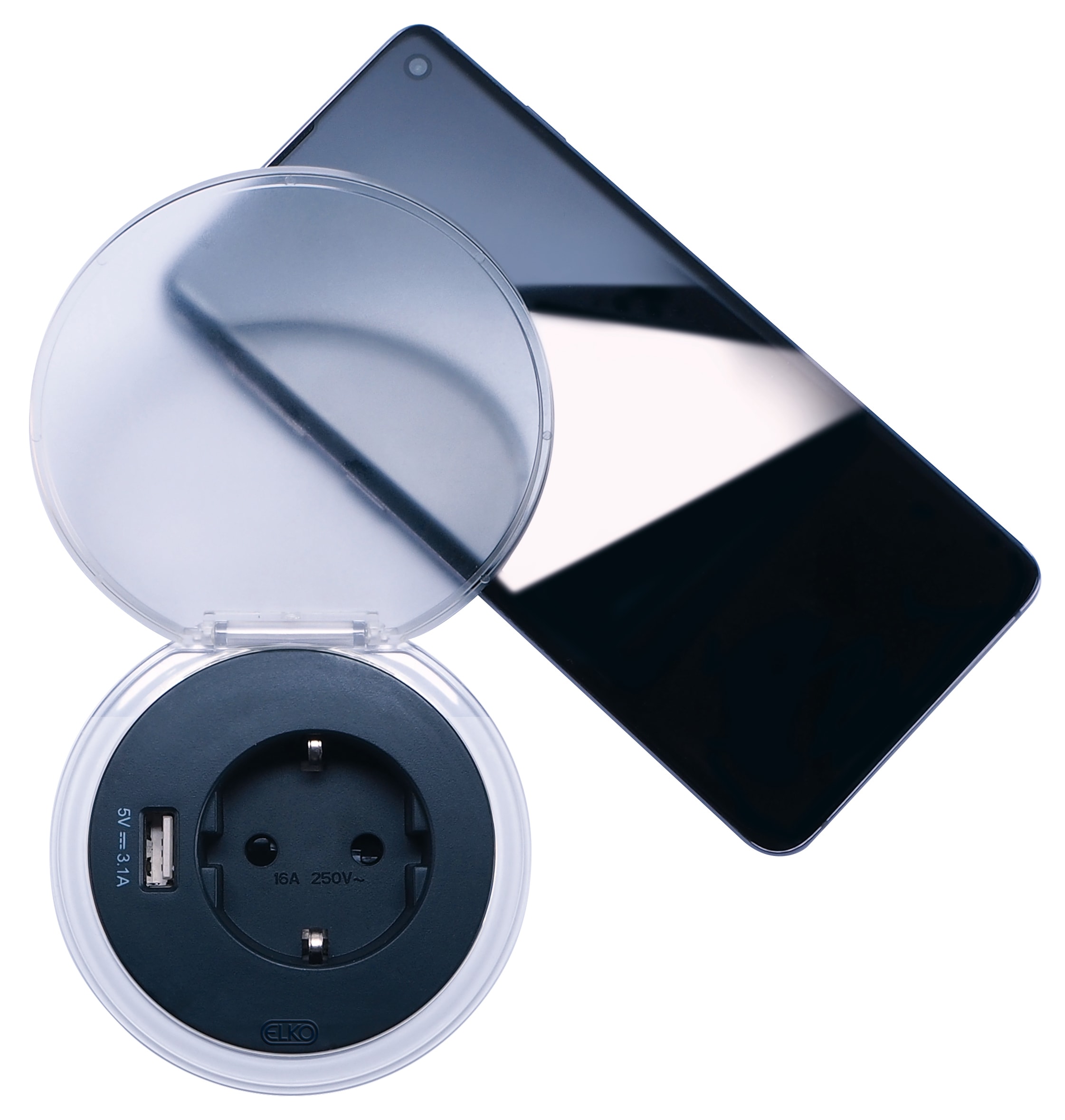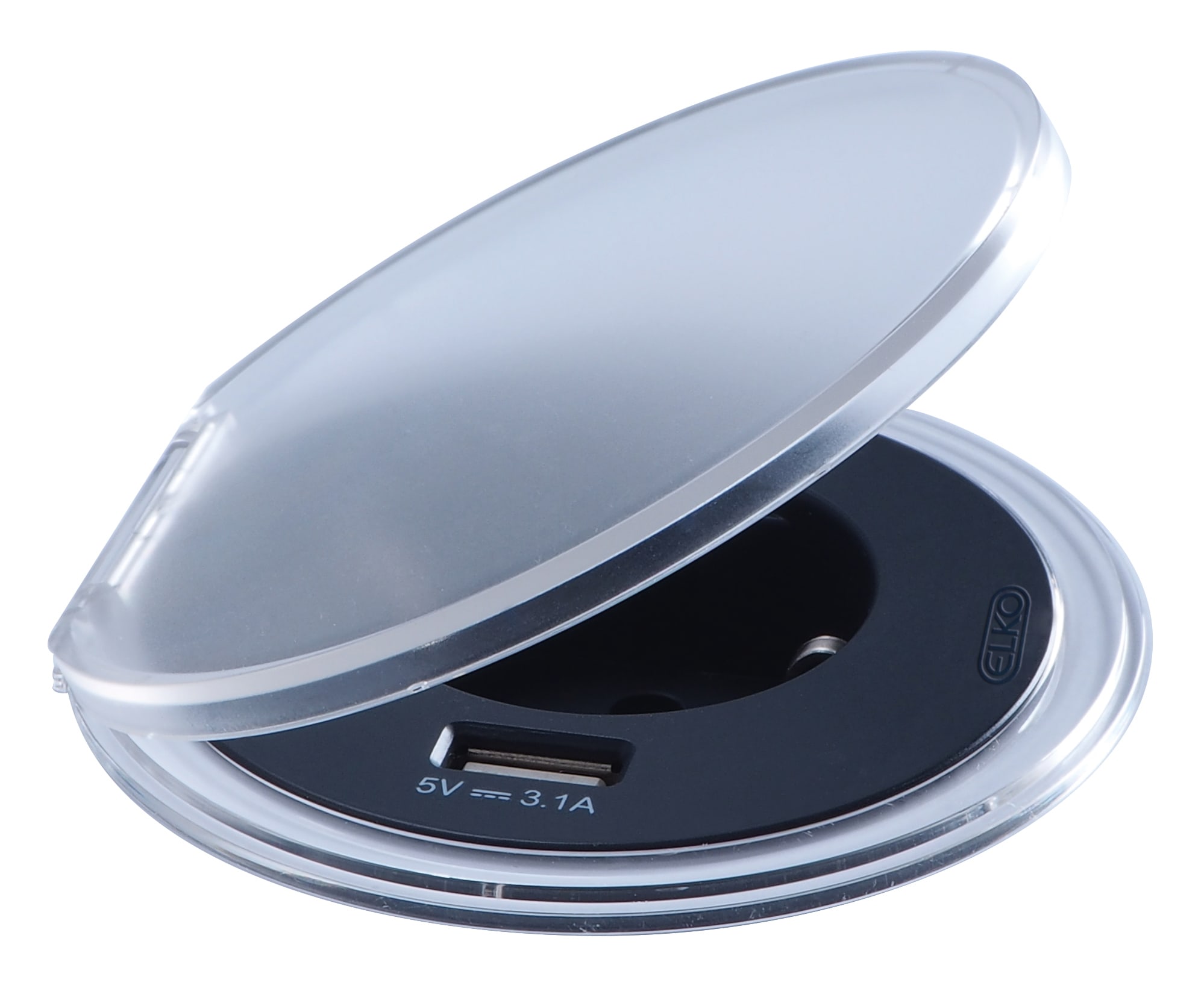 Elko - Borduttak med USB-A lader med stikkontakt. Borduttaket felles ned i f.eks kjøkkenbenk el skrivebord - EKO04461