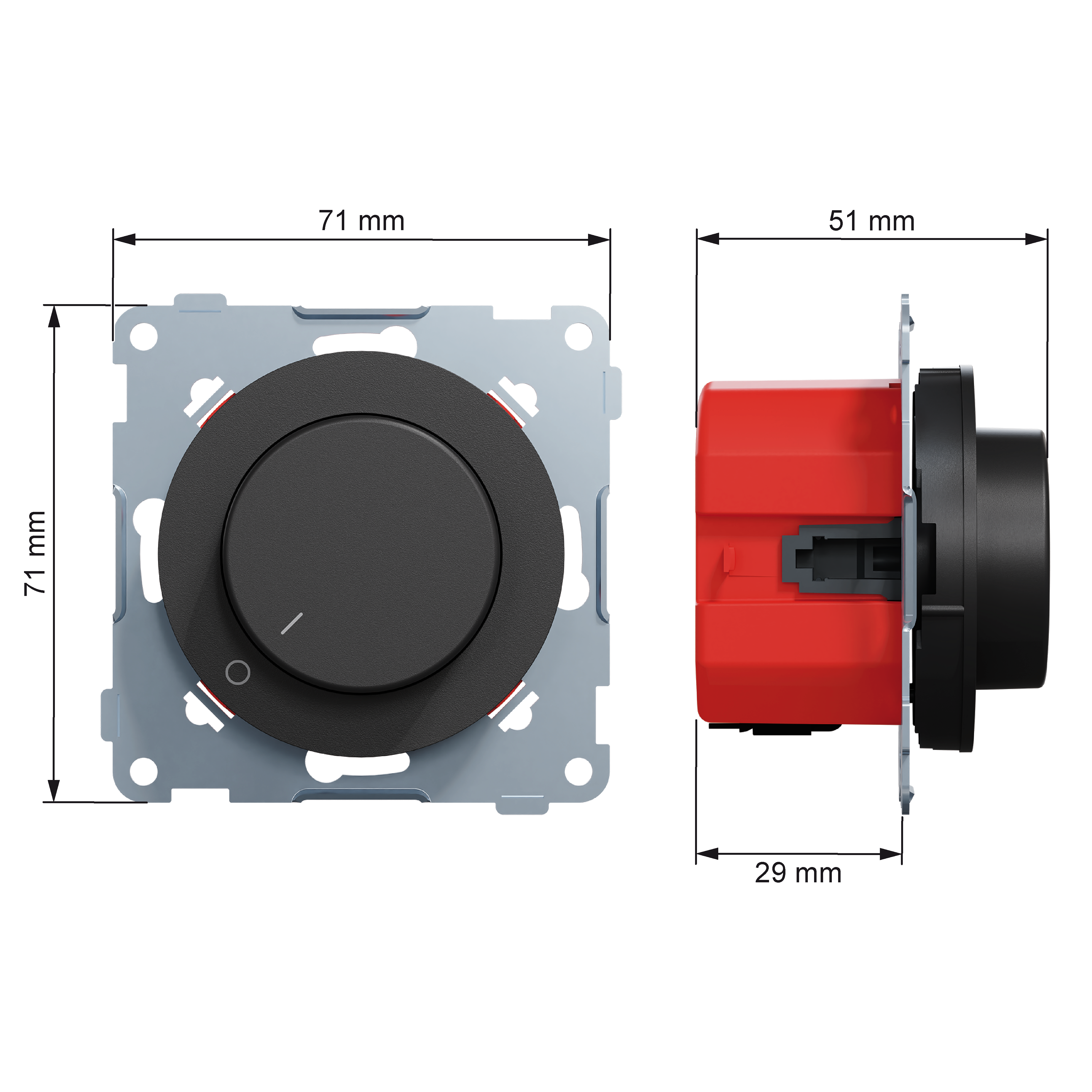 Mål på produktet er (B) 71 mm x (H) 71 mm x (D) 51 mm. Produktet er laget av resirkulert polykarbonat (PC), og fargen er sort (RAL 9005) med matt overflate. IP grad beskyttelse er IP21. Produktet er i samsvar med standarden EN 60669-2-1, og har CE-produktsertifisering.