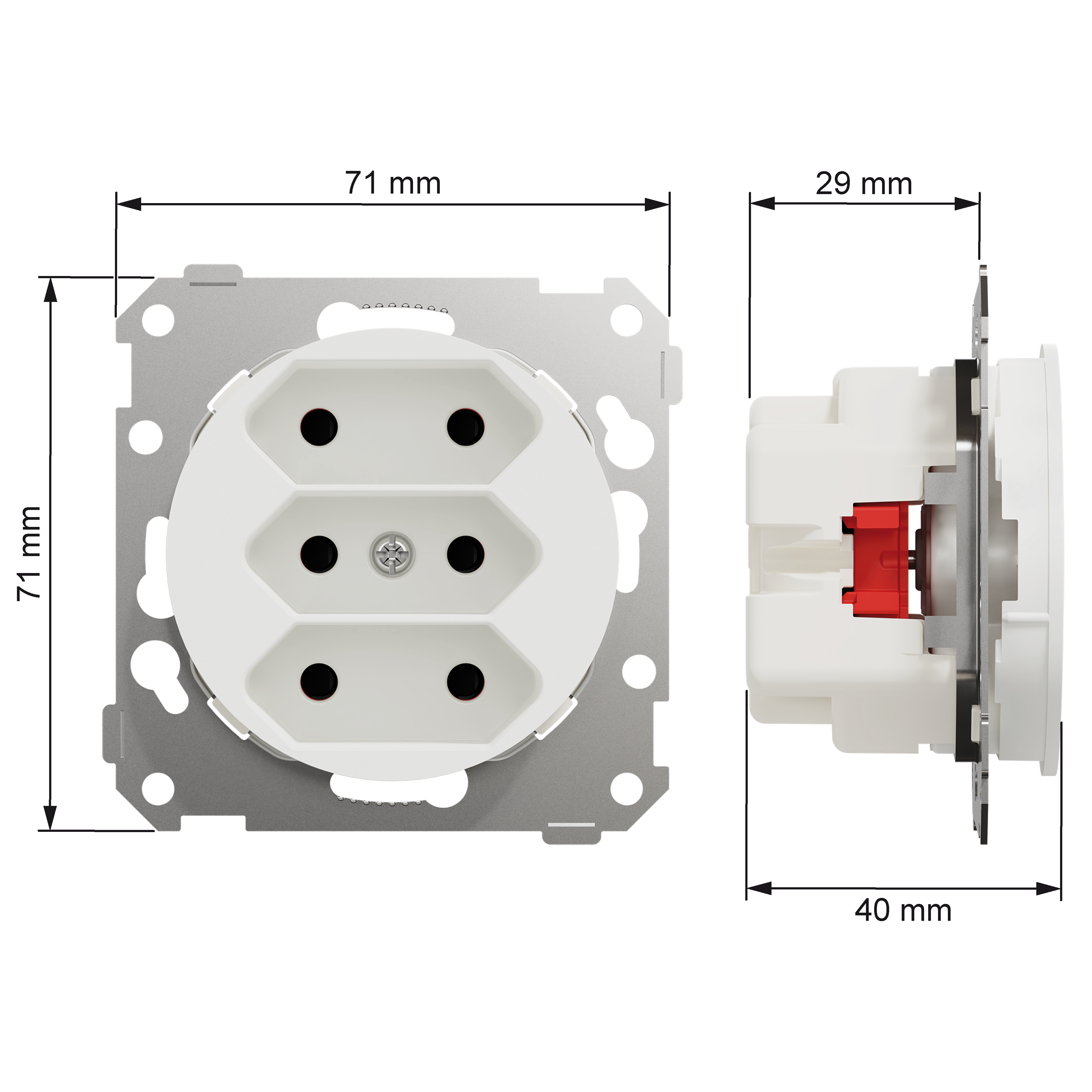 Mål på produktet er (B) 71mm x (H) 71mm x (D) 40mm. Produktet er laget av resirkulert polykarbonat (PC), og fargen er renhvit (RAL 9003) med matt overflate. IP grad beskyttelse er IP21.