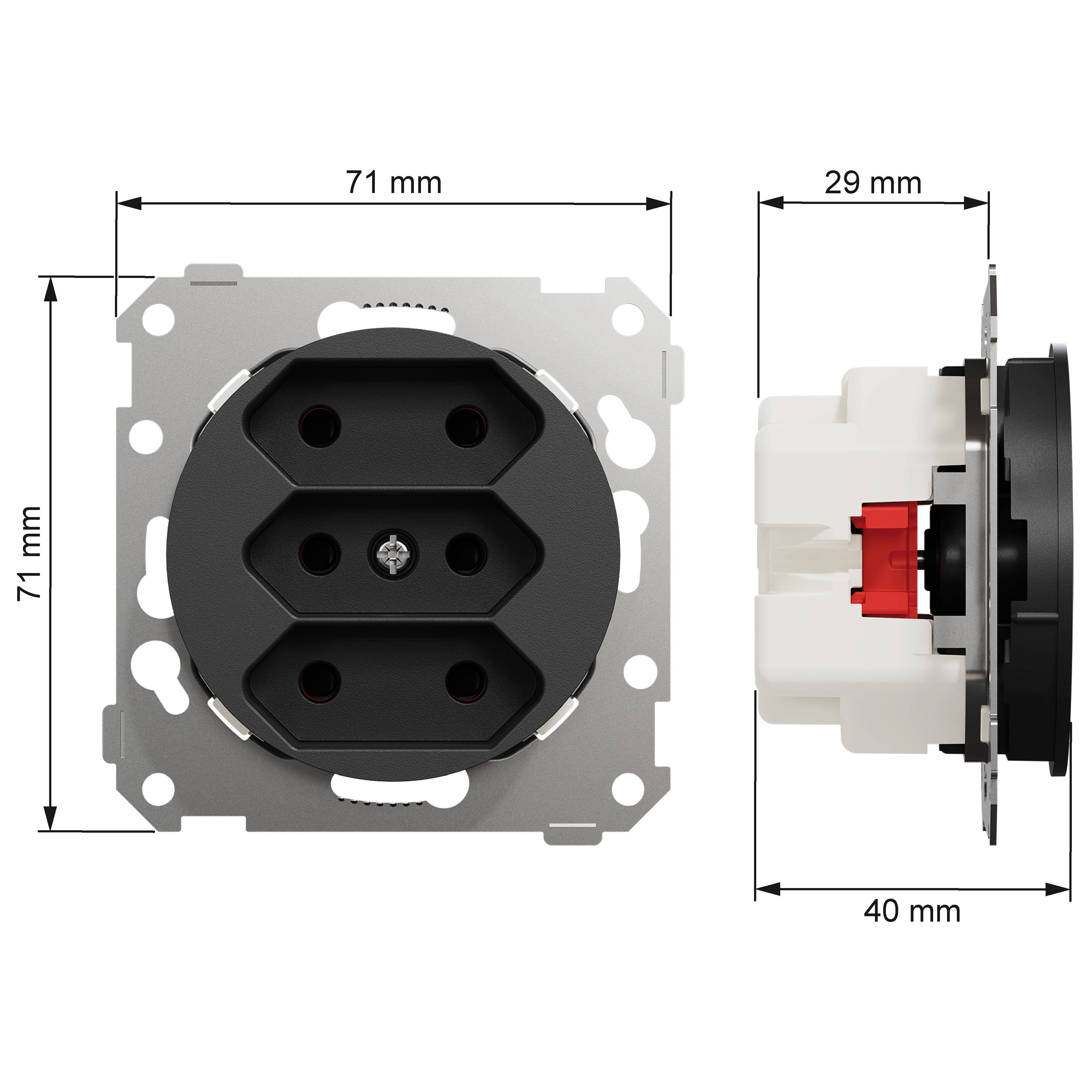 Mål på produktet er (B) 71mm x (H) 71mm x (D) 40mm. Produktet er laget av resirkulert polykarbonat (PC), og fargen er sort (RAL 9005) med matt overflate. IP grad beskyttelse er IP21.