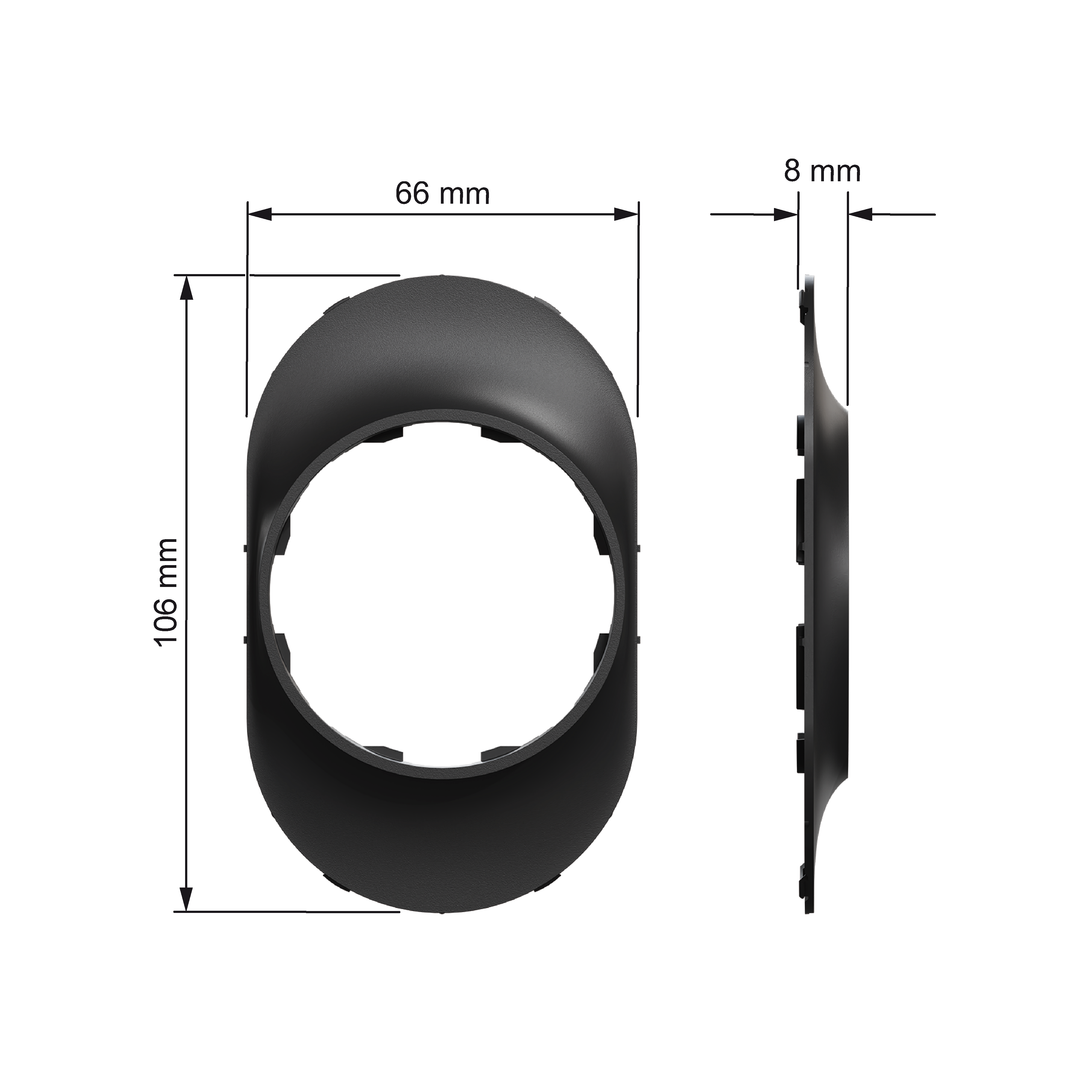 Mål på produktet er (B) 66 mm x (H) 106 mm x (D) 8 mm. Produktet er laget av resirkulert polykarbonat (PC), og fargen er sort (RAL 9005) med matt overflate. IP grad beskyttelse er IP21.