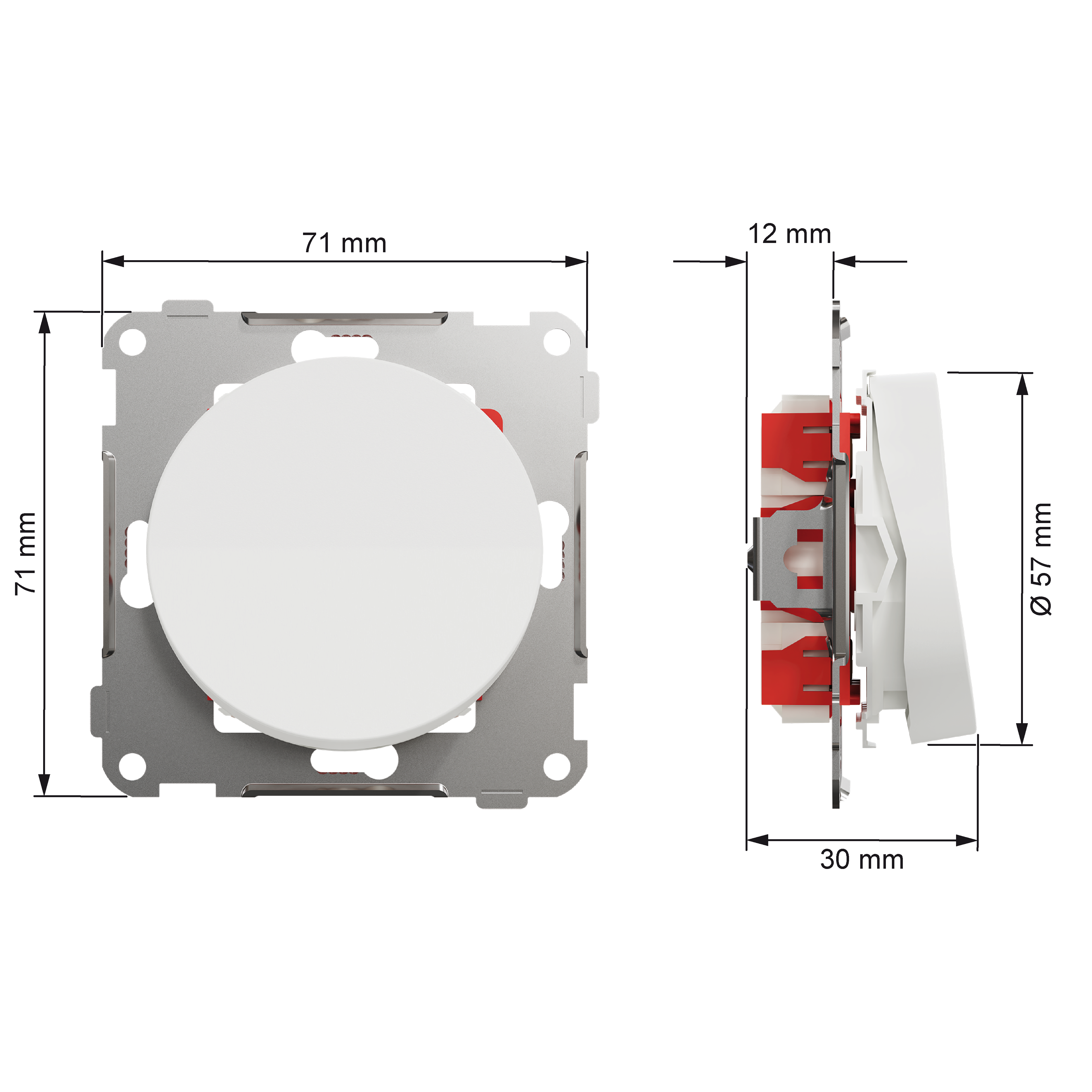 Mål på produktet er (B) 71mm x (H) 71mm x (D) 30mm. Produktet er laget av resirkulert polykarbonat (PC), og fargen er renhvit (RAL 9003) med matt overflate. Nominell driftsspenning er satt til 250VAC og nominell driftsstrøm er 16A. Den når IP21 beskyttelsesgrad med IK07 slagstyrke.