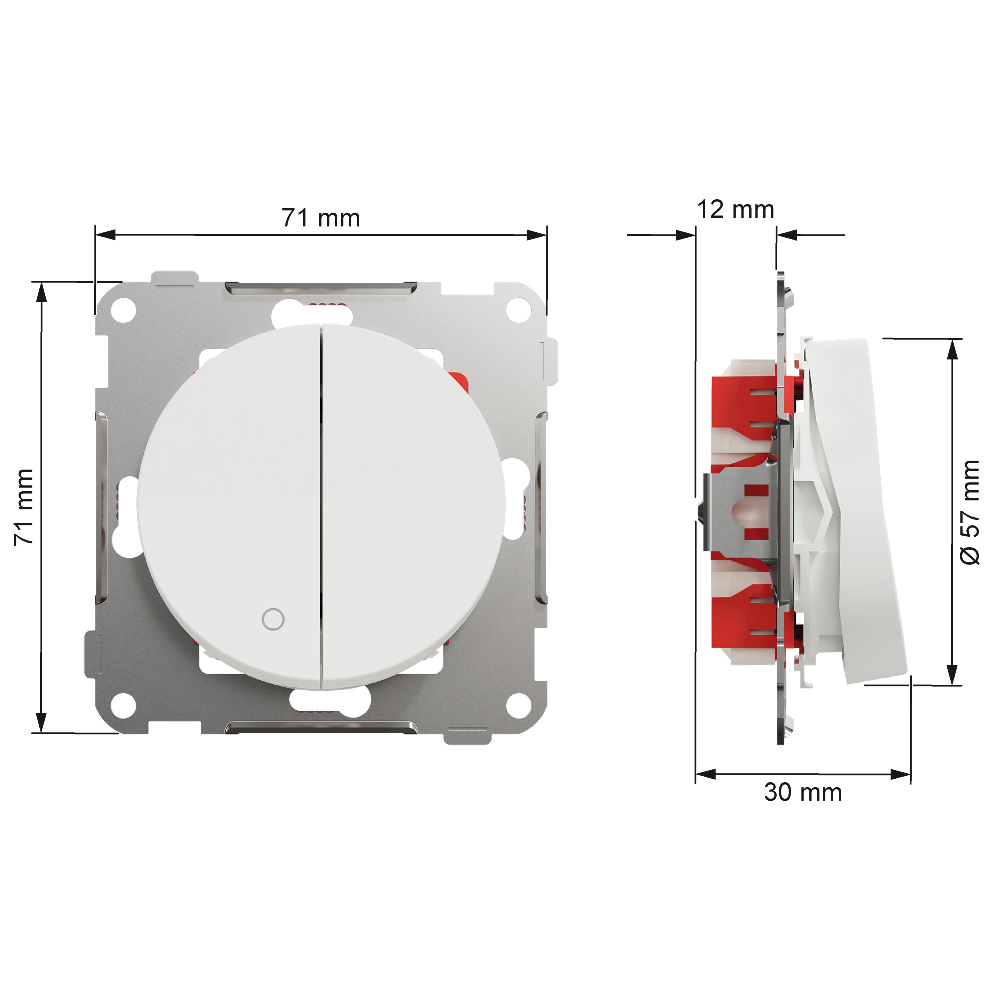 Mål på produktet er (B) 71mm x (H) 71mm x (D) 30mm. Produktet er laget av resirkulert polykarbonat (PC), og fargen er renhvit (RAL 9003) med matt overflate. Nominell driftsspenning er satt til 250VAC og nominell driftsstrøm er 16A. Den når IP21 beskyttelsesgrad med IK07 slagstyrke.