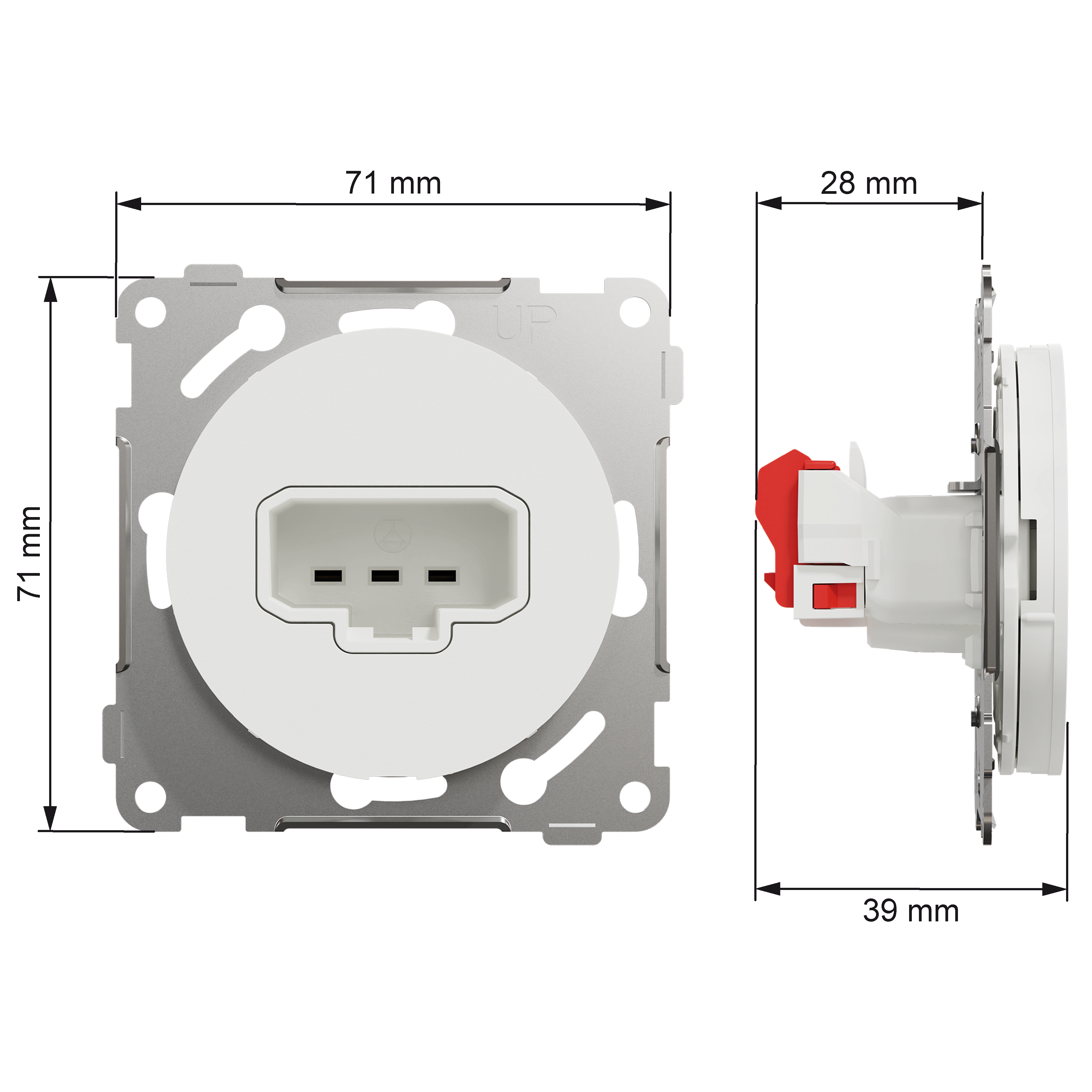 Mål på produktet er (B) 71mm x (H) 71mm x (D) 39mm. Produktet er laget av resirkulert polykarbonat (PC), og fargen er renhvit (RAL 9003) med matt overflate. IP grad beskyttelse er IP21.