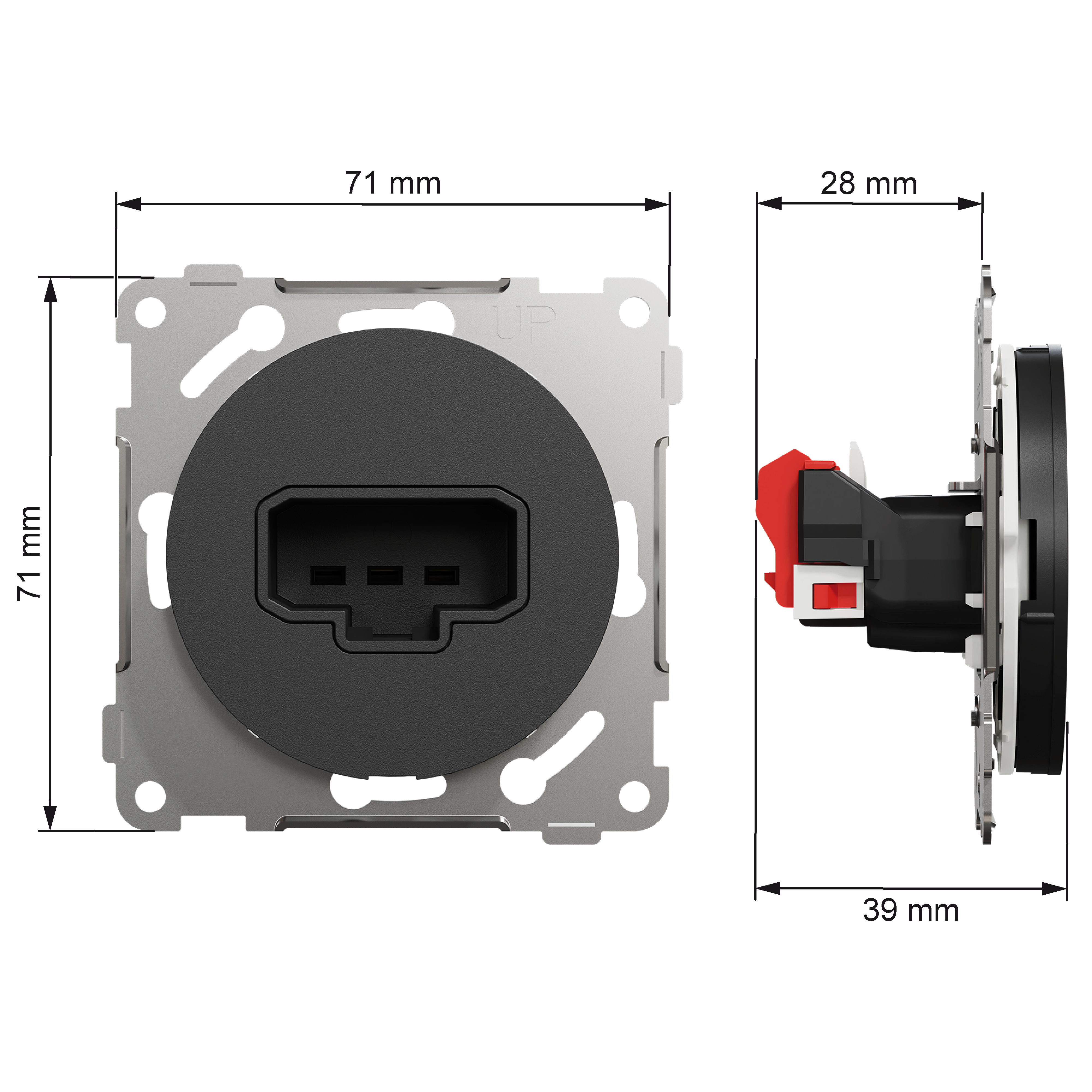 Mål på produktet er (B) 71mm x (H) 71mm x (D) 39mm. Produktet er laget av resirkulert polykarbonat (PC), og fargen er sort (RAL 9005) med matt overflate. IP grad beskyttelse er IP21.