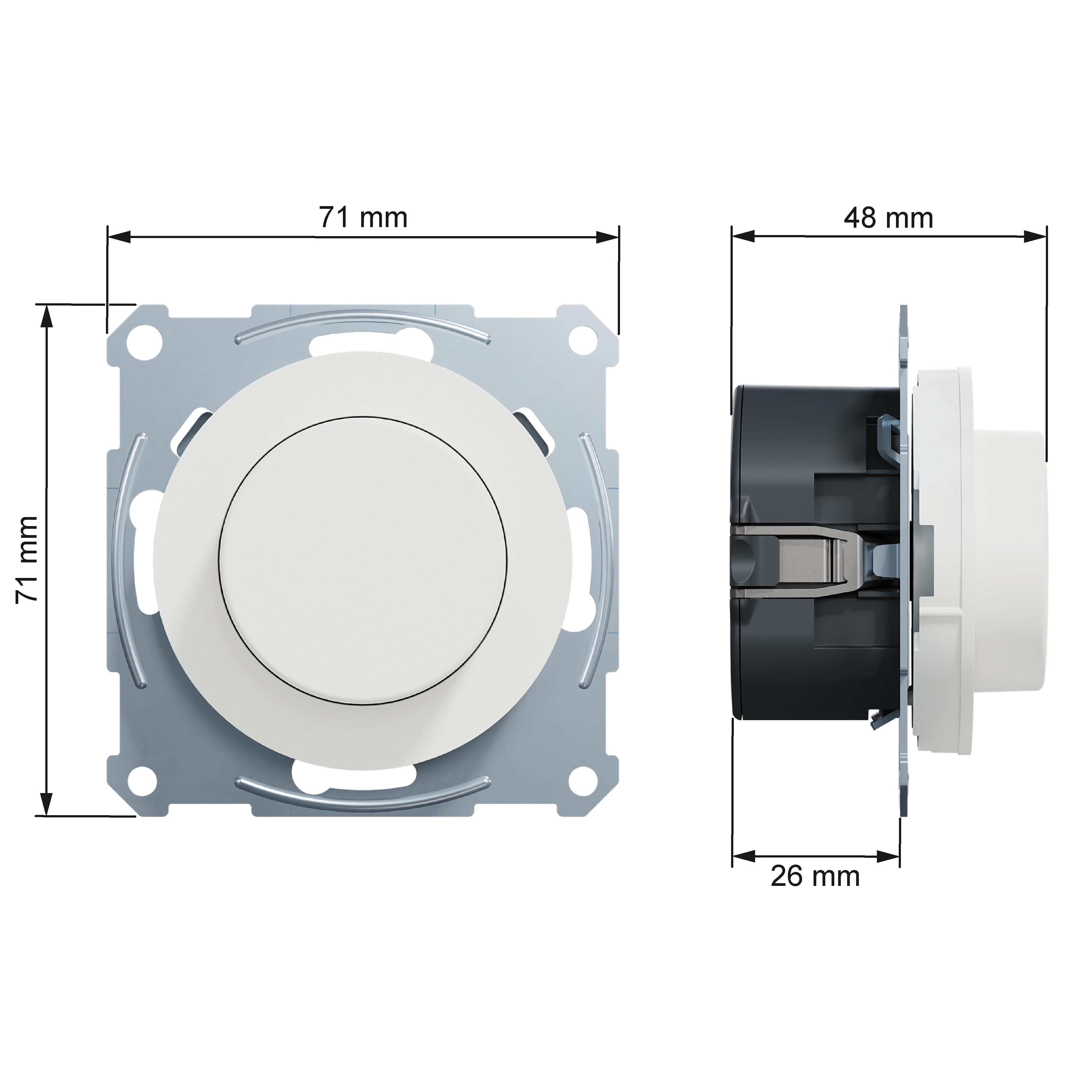 Mål på produktet er (B) 71 mm x (H) 71 mm x (D) 51 mm. Produktet er laget av resirkulert polykarbonat (PC), og fargen er renhvit (RAL 9003) med matt overflate. IP grad beskyttelse er IP21. Produktet er i samsvar med standarden EN 60669-2-1, og har CE-produktsertifisering.