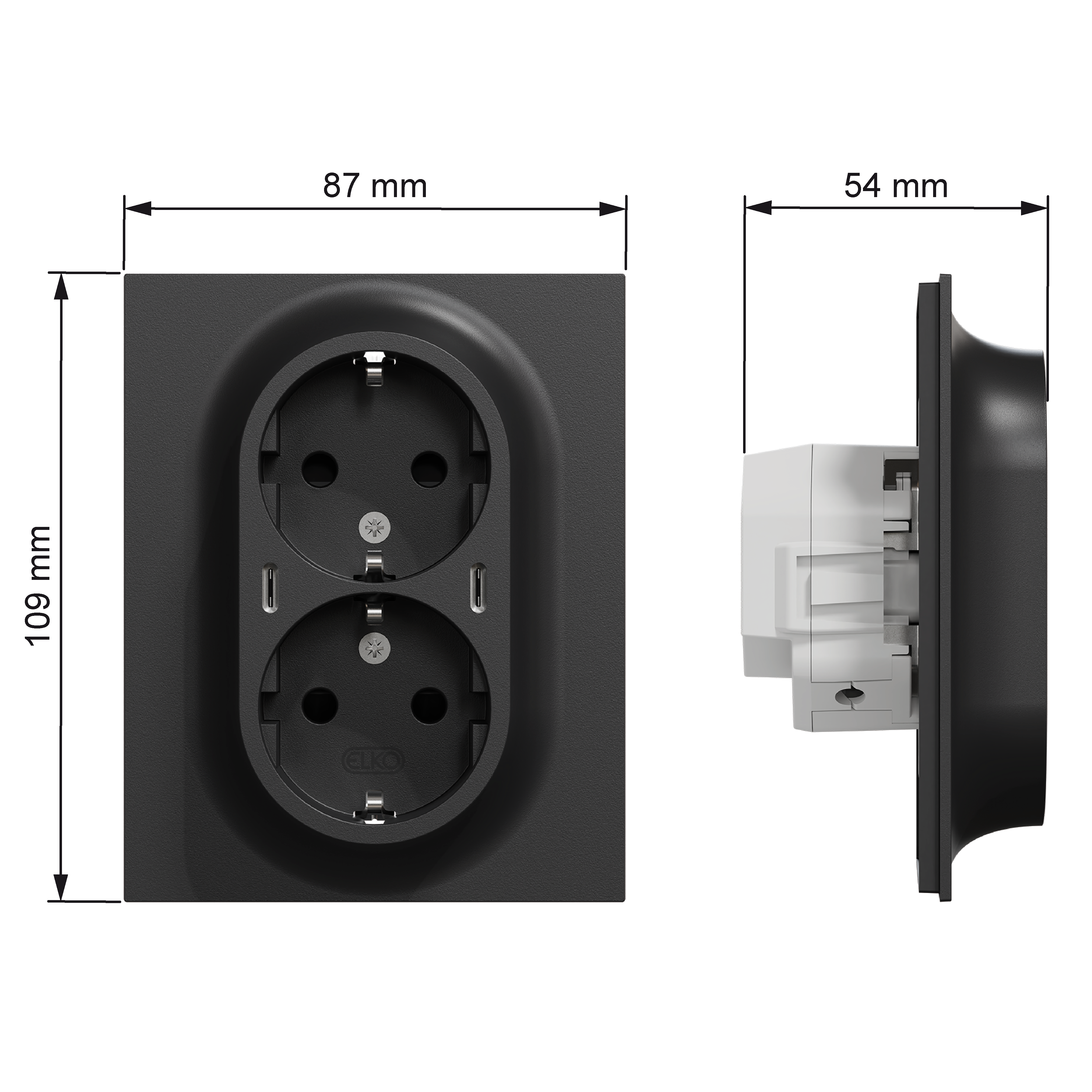 Ue nominelle driftsspenning er 250VAC ved 50Hz. Schuko-stikkontaktens utgangsstrøm er 16A. Maksimal effekt på USB-C uttaketer 25W. Standby-strømmen er under 0,1W, med en VI-nivåeffektivitet. Den kan monteres i en 1 eller 1,5 modul innfelt veggboks eller i en 1,5 modul påvegg.