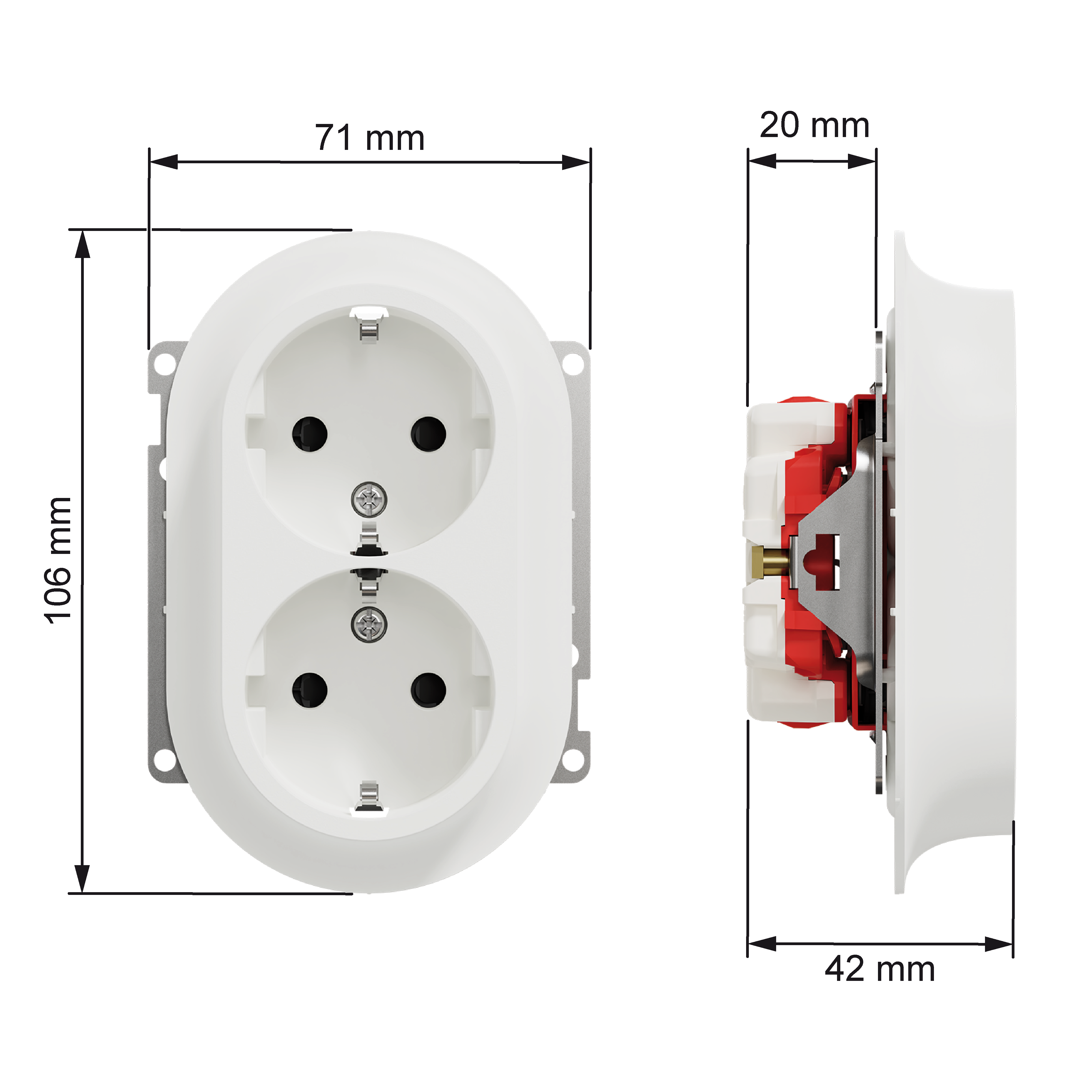 Mål på produktet er (B) 71mm x (H) 106mm x (D) 42mm. Produktet er laget av resirkulert polykarbonat (PC) og fargen er renhvit (RAL 9003) med en matt overflate. IP grad er IP21.
