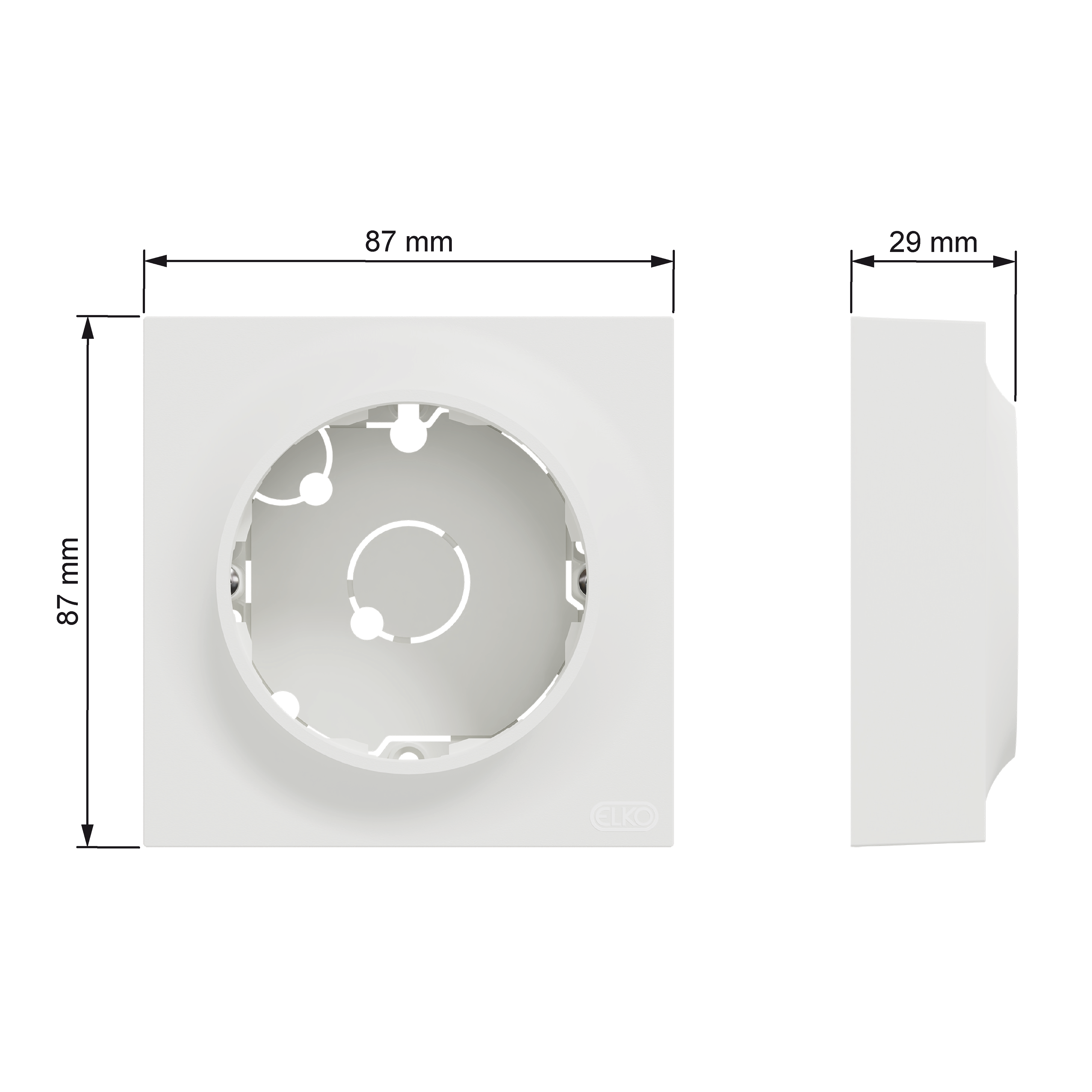 Mål på produktet er (B) 87 mm x (H) 87 mm x (D) 29 mm. Produktet er laget av resirkulert polykarbonat (PC), og fargen er renhvit (RAL 9003) med matt overflate. IP grad beskyttelse er IP21 dersom kabel kommer inn nedenfra. Ellers er det IP20-beskyttelse.