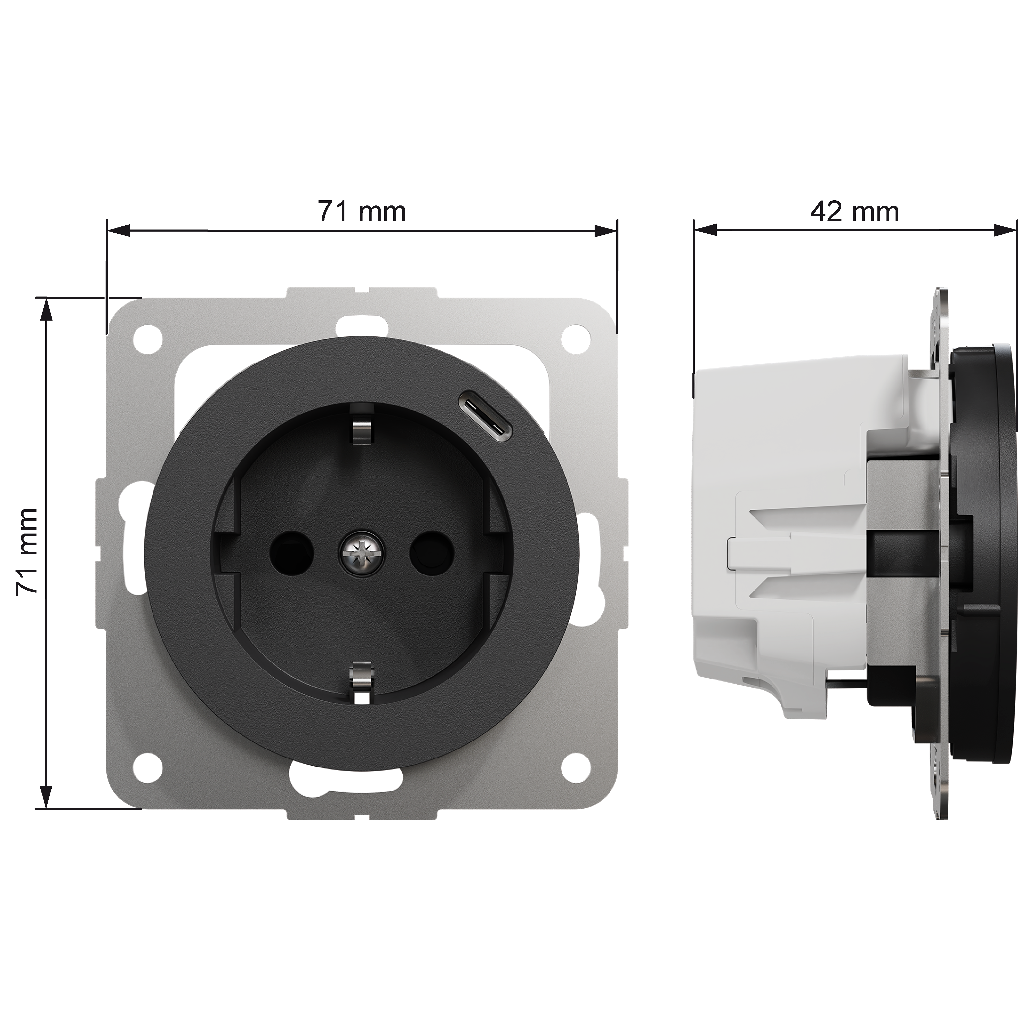 Mål på produktet er (B) 71 mm x (H) 71 mm x (D) 42 mm. Produktet er laget av resirkulert polykarbonat (PC) og fargen er sort (RAL 9005) med en matt overflate. IP grad er IP21.