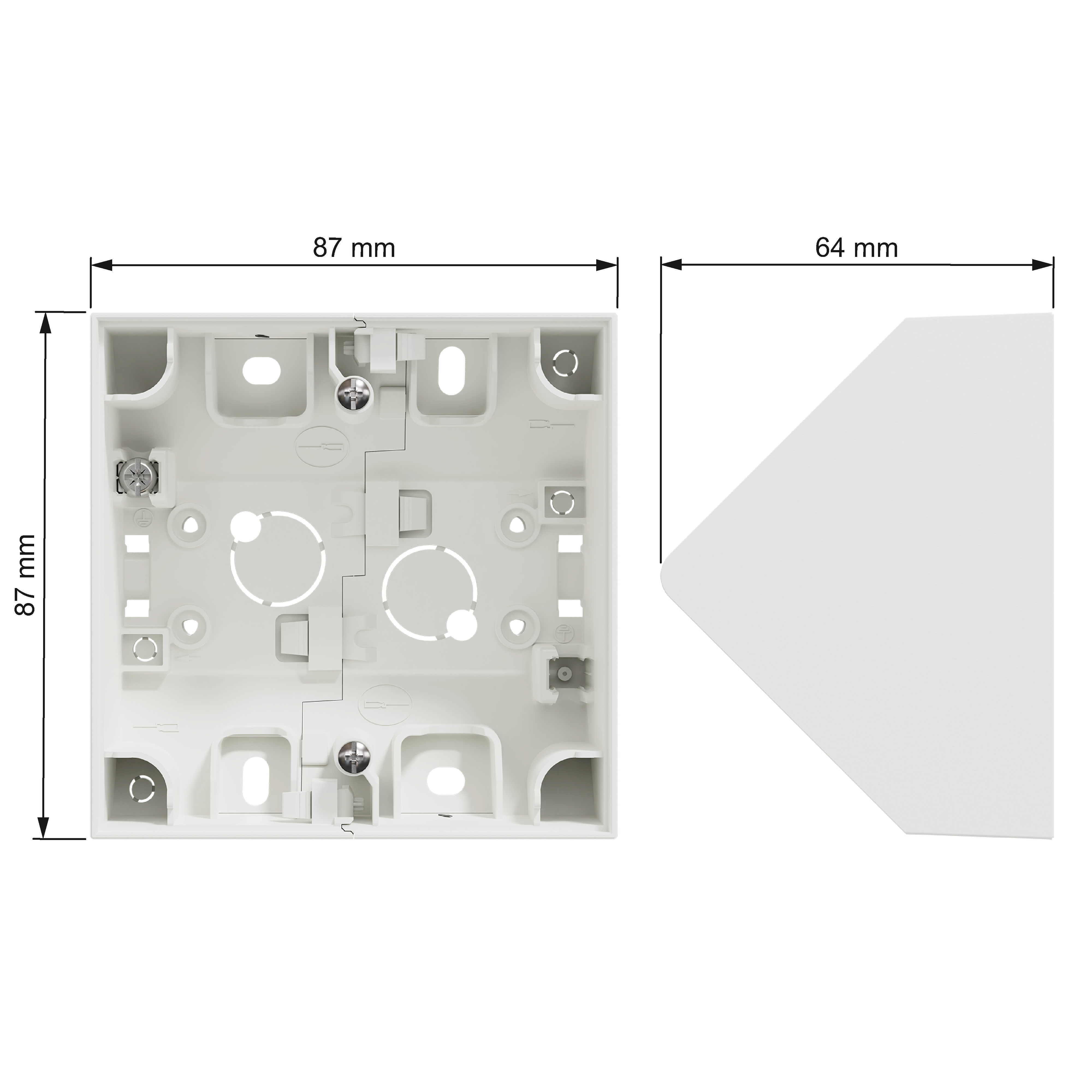 Mål på produktet er (B) 87mm x (H) 87mm x (D) 64mm. Produktet er laget av resirkulert polykarbonat (PC), og fargen er renhvit (RAL 9003) med matt overflate. IP grad beskyttelse er IP21 dersom kabel kommer inn nedenfra. Ellers er det IP20-beskyttelse.