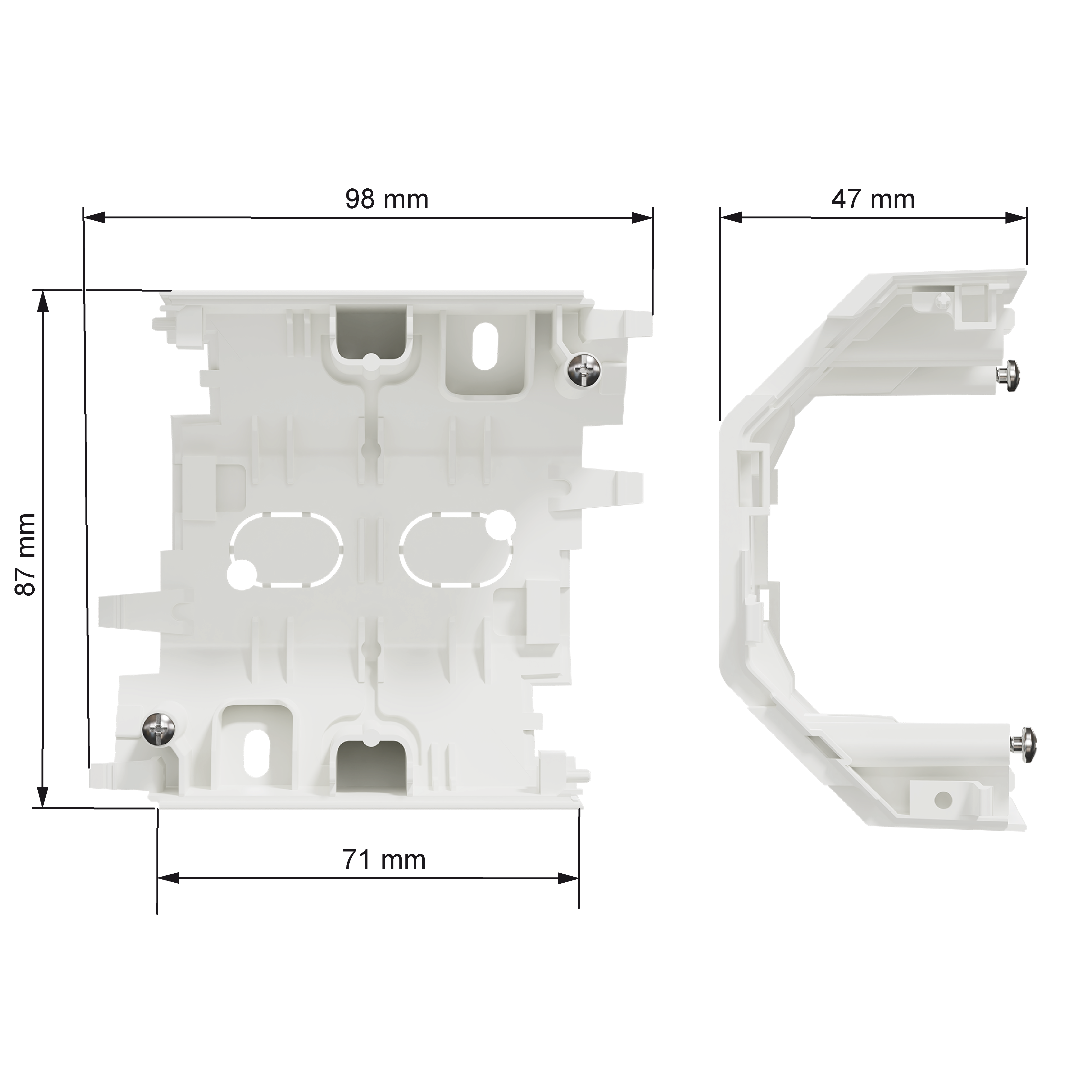 Mål på produktet er (B) 87 mm x (H) 98 mm x (D) 47 mm. Produktet er laget av resirkulert polykarbonat (PC) og fargen er renhvit (RAL 9003) med en matt overflate. IP grad er satt til IP21 når kabelen kommer inn nedenfra. Ellers er den på IP20-beskyttelse.