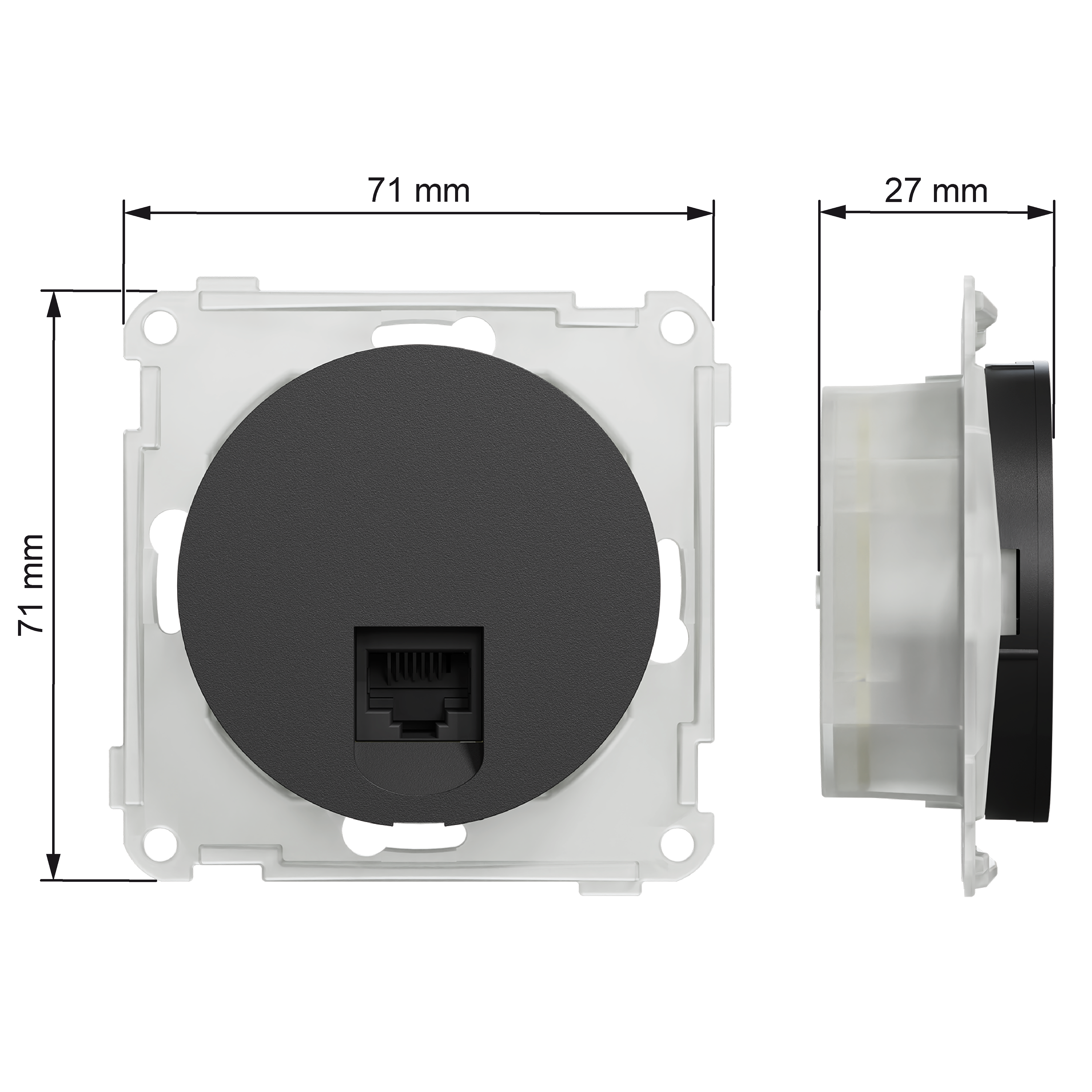 ELKO One modulæruttak 1x8 kat 6 UTP for LSA terminering. Modulæruttak i ELKO One design med ett uttak i kat. 6 UTP utførelse. De er enkle å installere og passer fint inn i en bolig eller i et kontormiljø. Tilkobling med LSA terminering med fargekode for T568A/B kobling. Monteres i 1- til 5-hulls ramme, innfelt eller i høy påveggskappe eller hjørnekappe. Mål på produktet er (B) 71 mm x (H) 71 mm x (D) 27 mm. Produktet er laget av resirkulert polykarbonat (PC) og fargen er sort (RAL 9005) med en matt overflate. IP grad er IP20. ELKO One-serien har et minimalistisk og slankt design med silkematt overflate. Serien dekker installasjonsmateriell, frittstående elektronikk og nettverksfunksjoner for både innfelt og påveggsmontering. Serien er også utviklet med bruk av resirkulert plast (alle estetiske deler, hvorav 40 % på renhvit og 95 % på sort), samt resirkulert emballasje.
