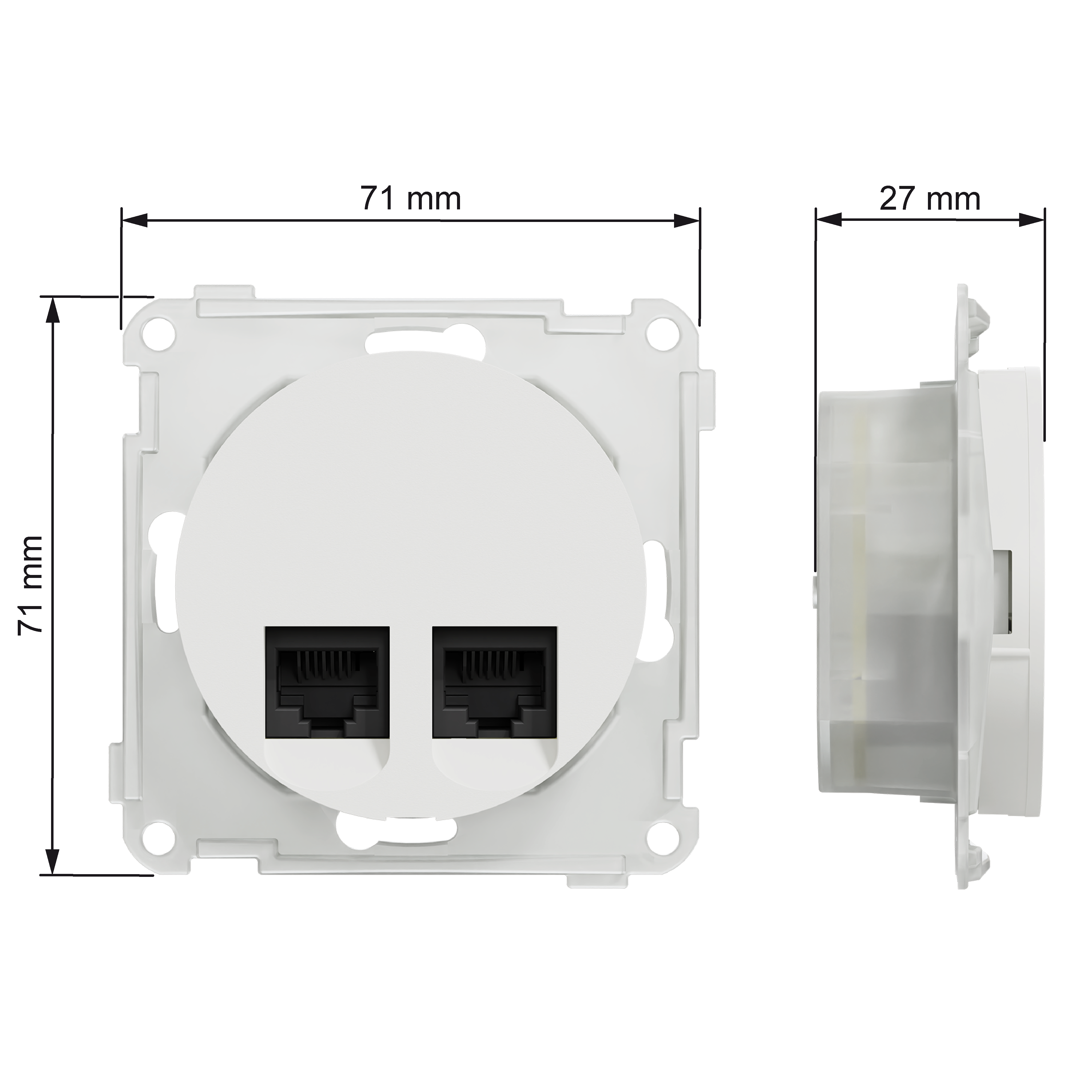 ELKO One modulæruttak 2x8 kat 6 UTP for LSA terminering. Modulæruttak i ELKO One design med to uttak i kat. 6 UTP utførelse. De er enkle å installere og passer fint inn i en bolig eller i et kontormiljø. Tilkobling med LSA terminering med fargekode for T568A/B kobling. Monteres i 1- til 5-hulls ramme, innfelt eller i høy påveggskappe eller hjørnekappe. Mål på produktet er (B) 71 mm x (H) 71 mm x (D) 27 mm. Produktet er laget av resirkulert polykarbonat (PC) og fargen er renhvit (RAL 9003) med en matt overflate. IP grad er IP20. ELKO One-serien har et minimalistisk og slankt design med silkematt overflate. Serien dekker installasjonsmateriell, frittstående elektronikk og nettverksfunksjoner for både innfelt og påveggsmontering. Serien er også utviklet med bruk av resirkulert plast (alle estetiske deler, hvorav 40 % på renhvit og 95 % på sort), samt resirkulert emballasje.