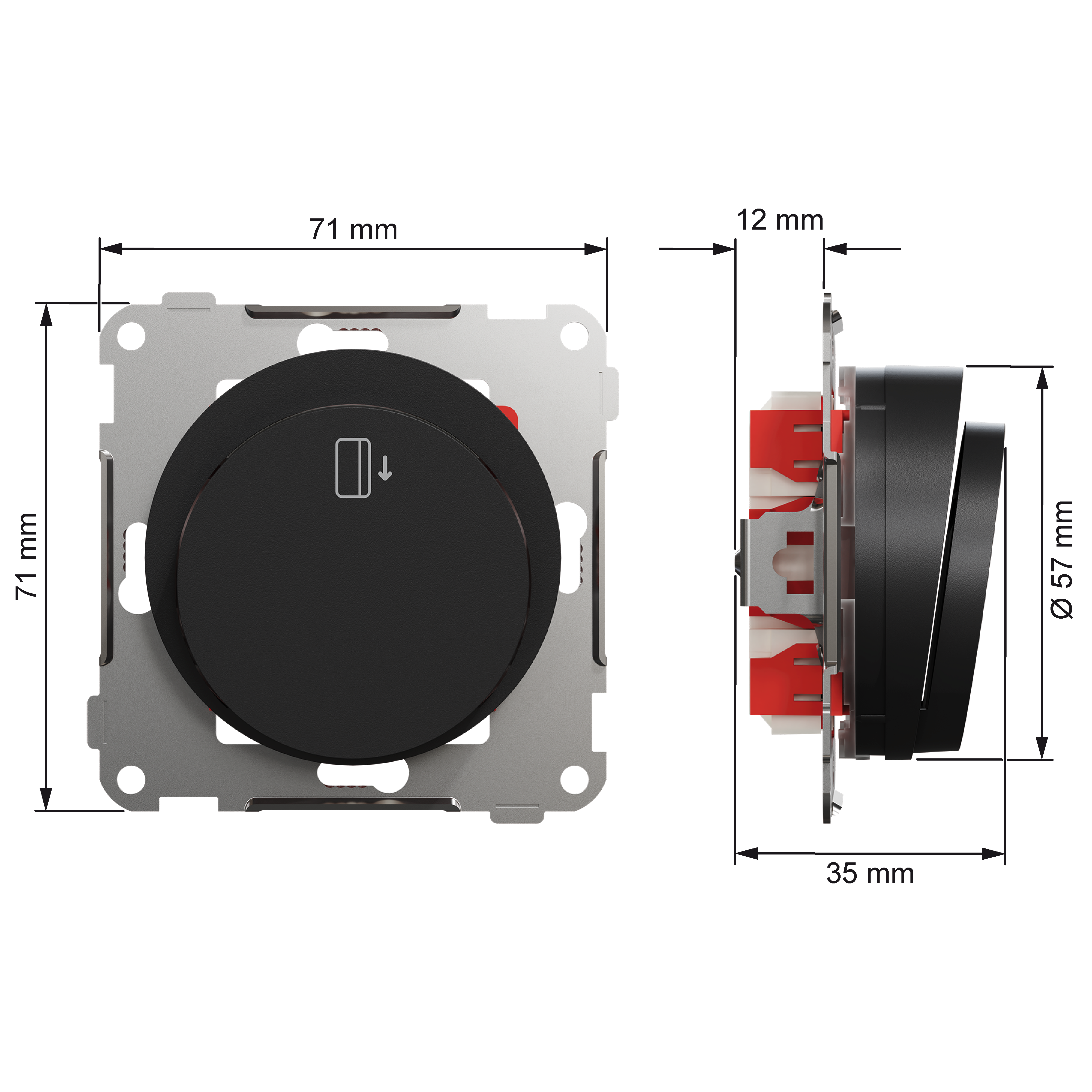 Mål på produktet er (B) 71 mm x (H) 71 mm x (D) 30 mm. Produktet er laget av resirkulert polykarbonat (PC), og fargen er sort (RAL 9005) med matt overflate. Nominell driftsspenning er satt til 250VAC og nominell driftsstrøm er 10A. Den når IP21 beskyttelsesgrad med IK07 slagstyrke.