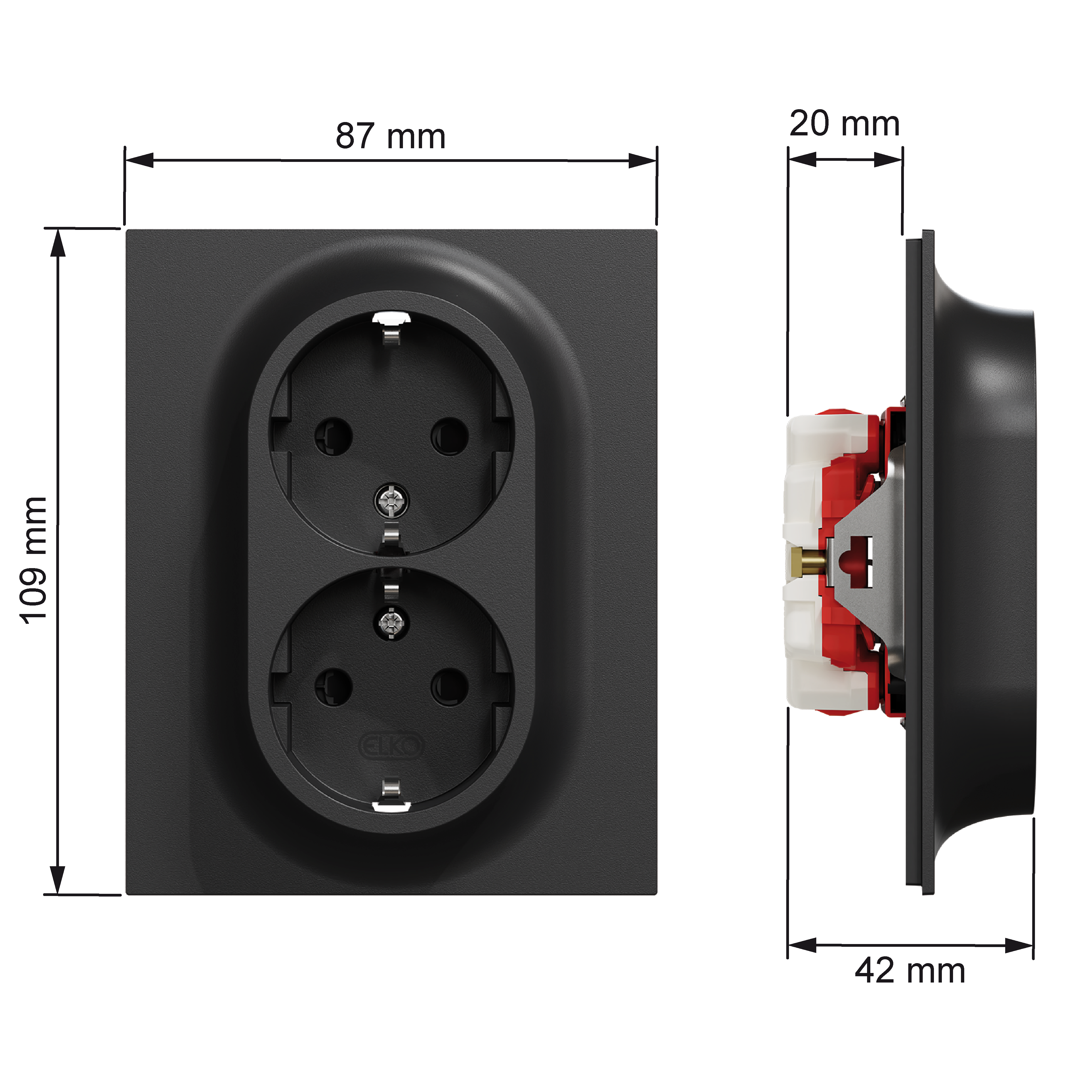 Ue-nominell driftsspenning er 250VAC ved 50/60Hz, og Ie-nominelle driftsstrøm er 16A. Mål på produktet er (B) 87 mm x (H) 109 mm x (D) 42 mm. Produktet er laget av resirkulert polykarbonat (PC) og fargen er sort (RAL 9005) med en matt overflate. IP grad er IP21.