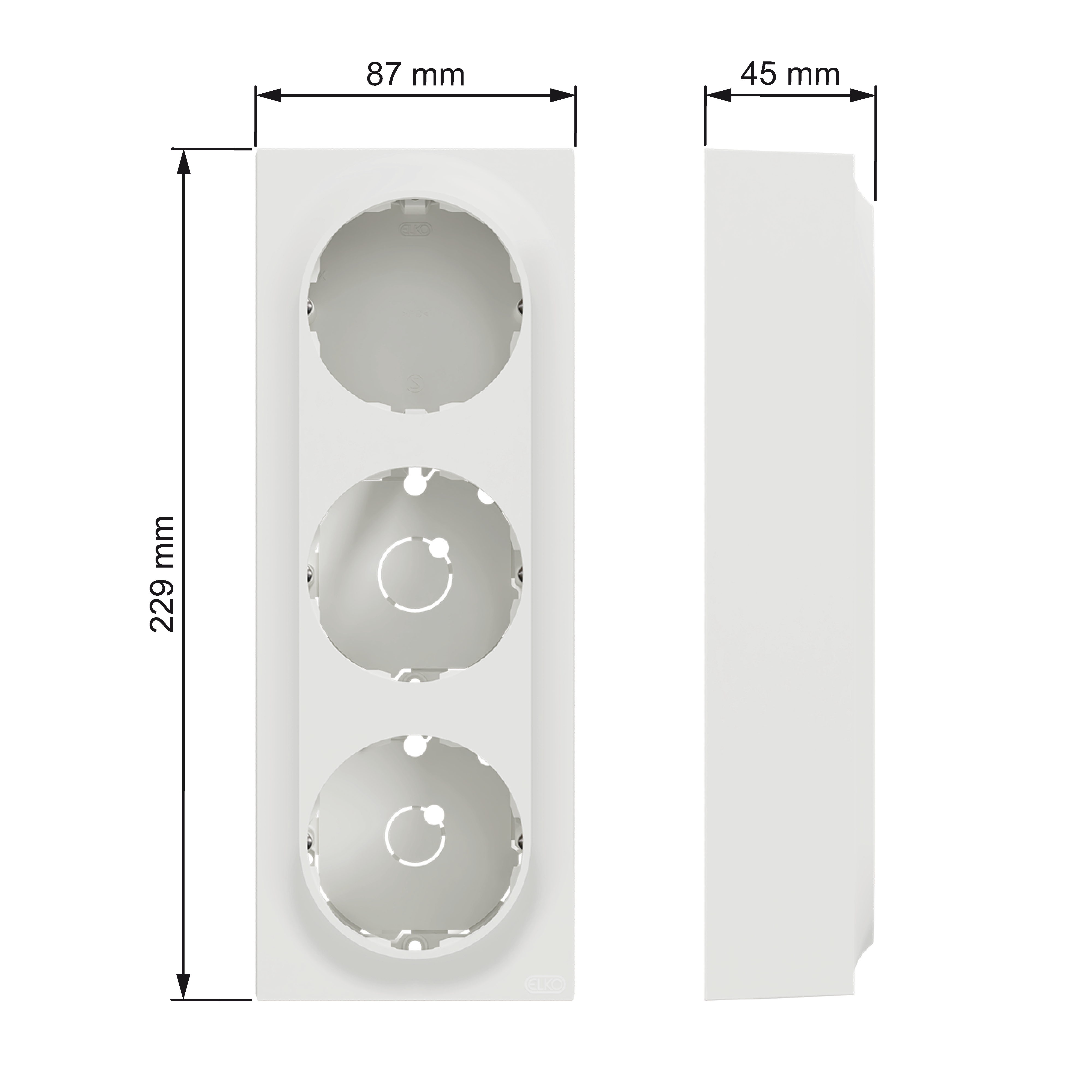 Mål på produktet er (B) 87mm x (H) 229mm x (D) 45mm. Produktet er laget av resirkulert polykarbonat (PC), og fargen er renhvit (RAL 9003) med matt overflate. IP grad beskyttelse er IP21 dersom kabel kommer inn nedenfra. Ellers er det IP20-beskyttelse.