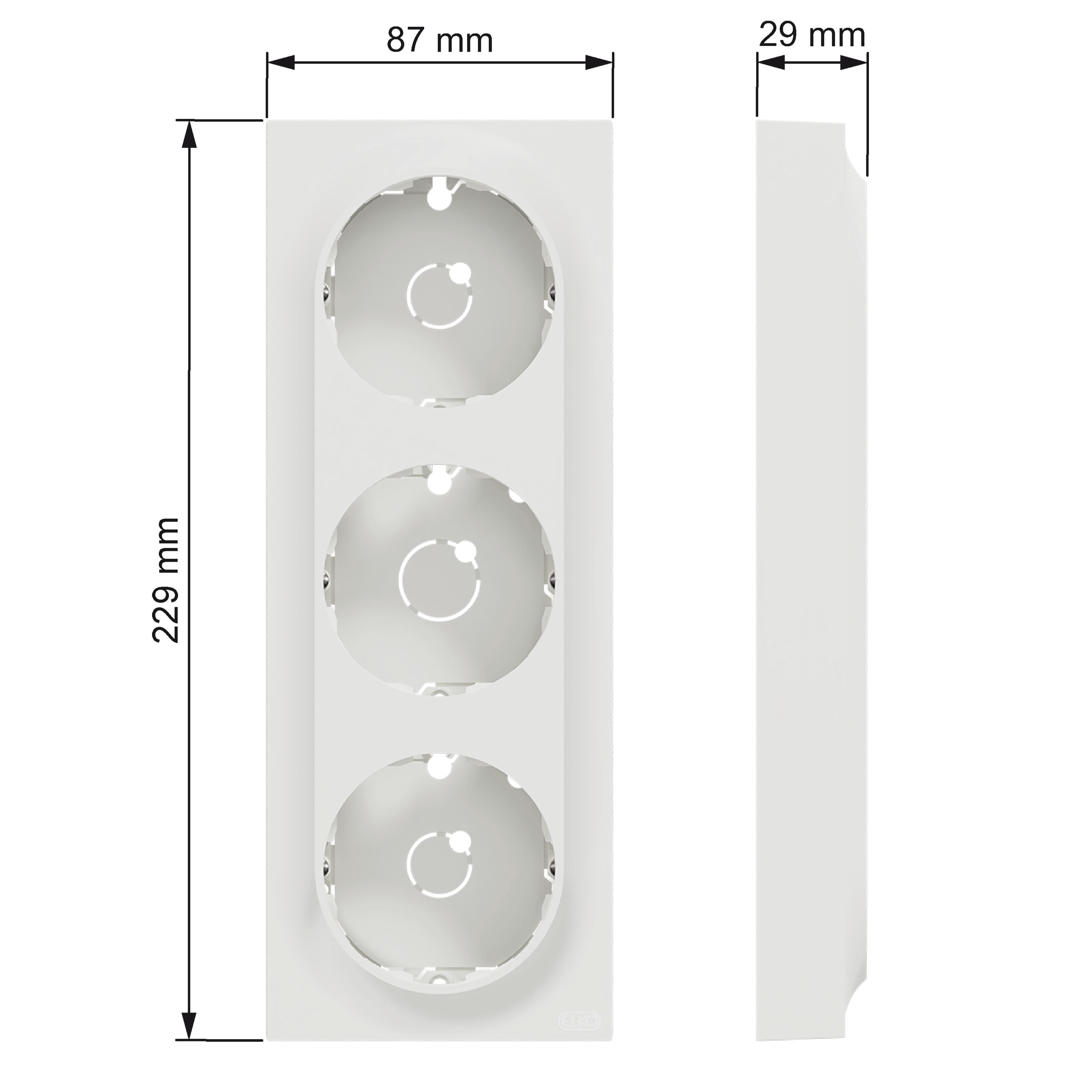 Mål på produktet er (B) 87mm x (H) 229 mm x (D) 29mm. Produktet er laget av resirkulert polykarbonat (PC), og fargen er renhvit (RAL 9003) med matt overflate. IP grad beskyttelse er IP21 dersom kabel kommer inn nedenfra. Ellers er det IP20-beskyttelse.