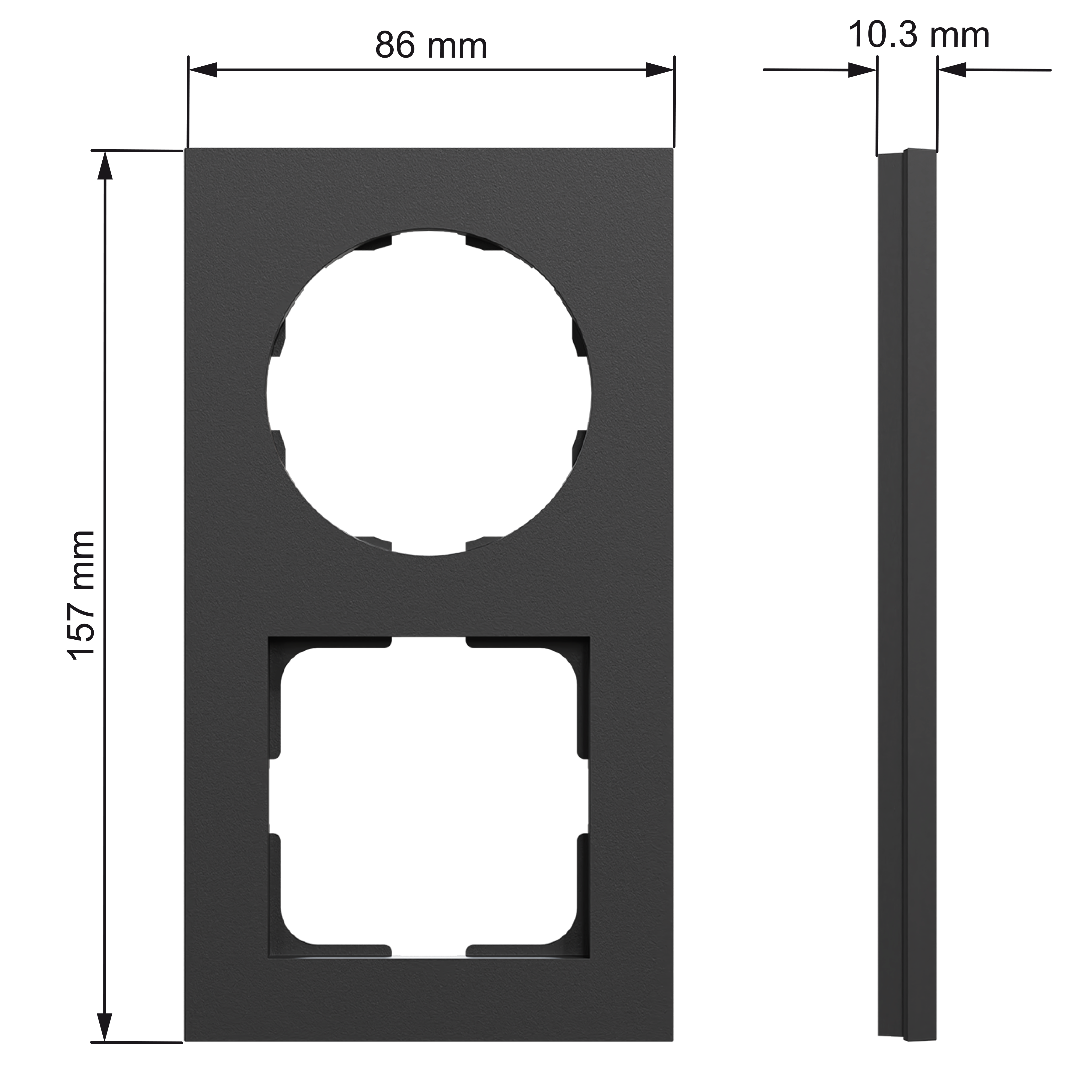 Dette produktet er designet for å kunne kombinere ett ELKO One produkt med ett eksisterende ELKO RS eller ELKO Plus produkt (56x56 mm). Mål på produktet er (B) 86 mm x (H) 157 mm x (D) 10,5 mm. Produktet er laget av resirkulert polykarbonat (PC), og fargen er sort (RAL 9005) med matt overflate.