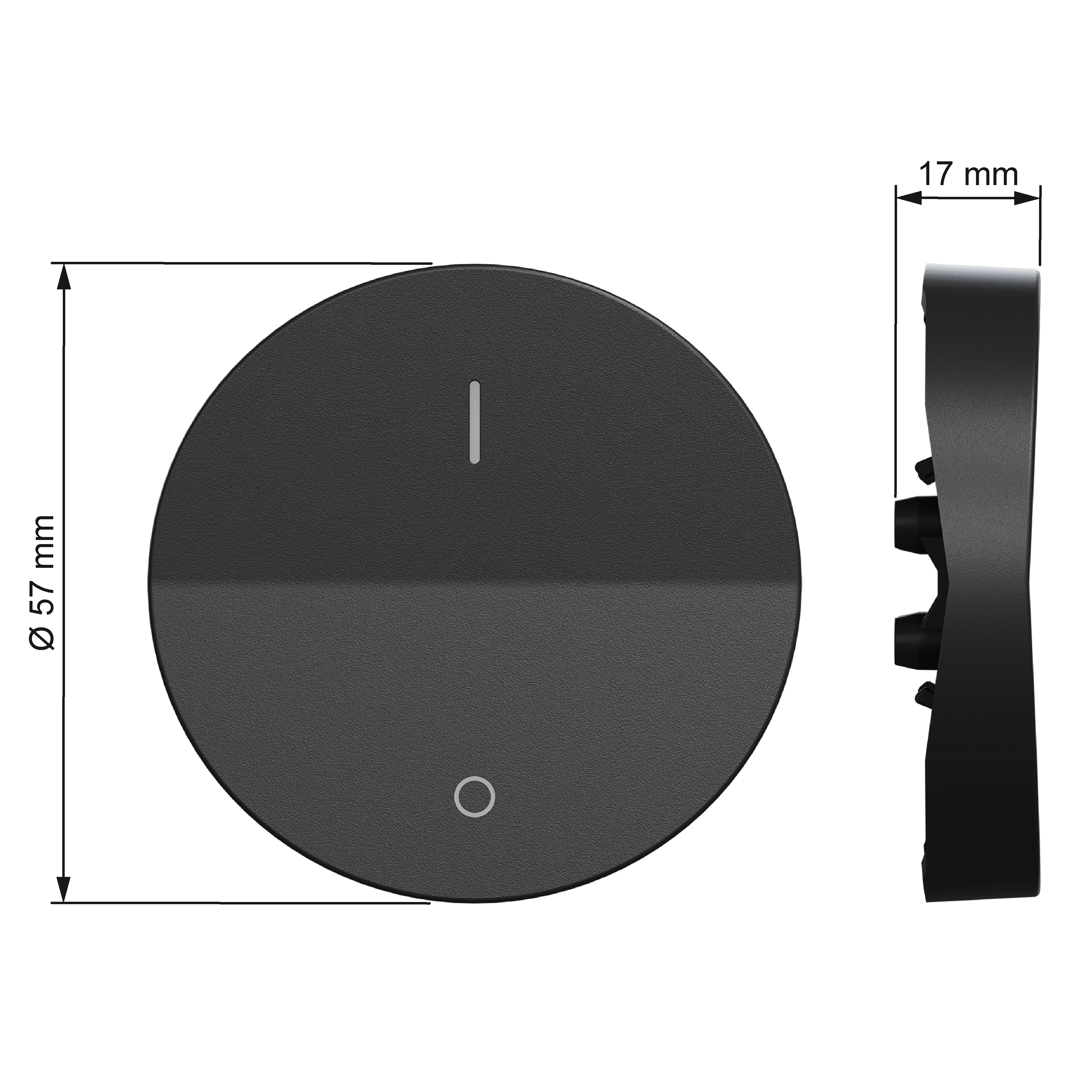 Diameteren på vippestykket er 57 mm. Produktet er laget av resirkulert polykarbonat (PC), og fargen er sort (RAL 9005) med matt overflate. IP grad beskyttelse er IP21.