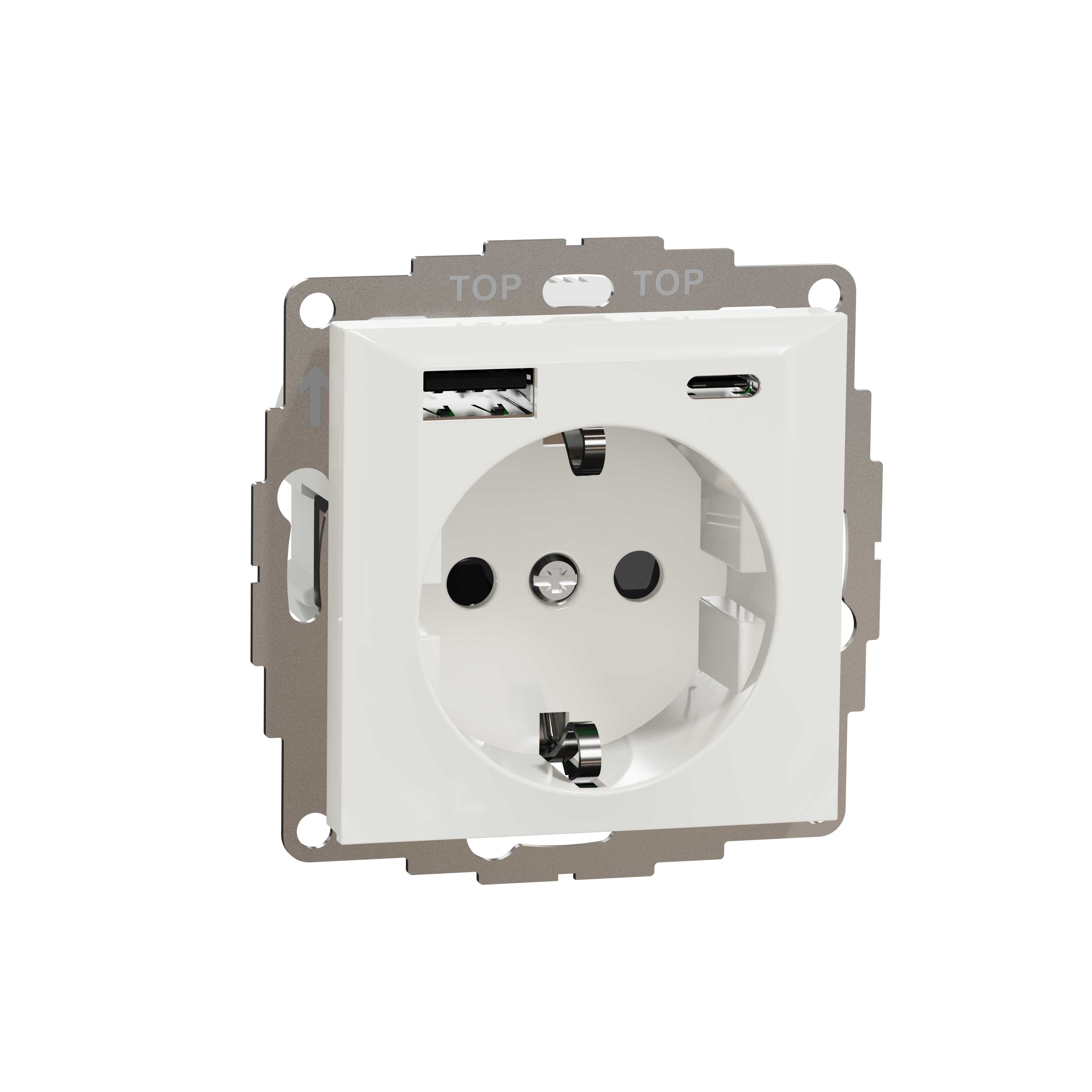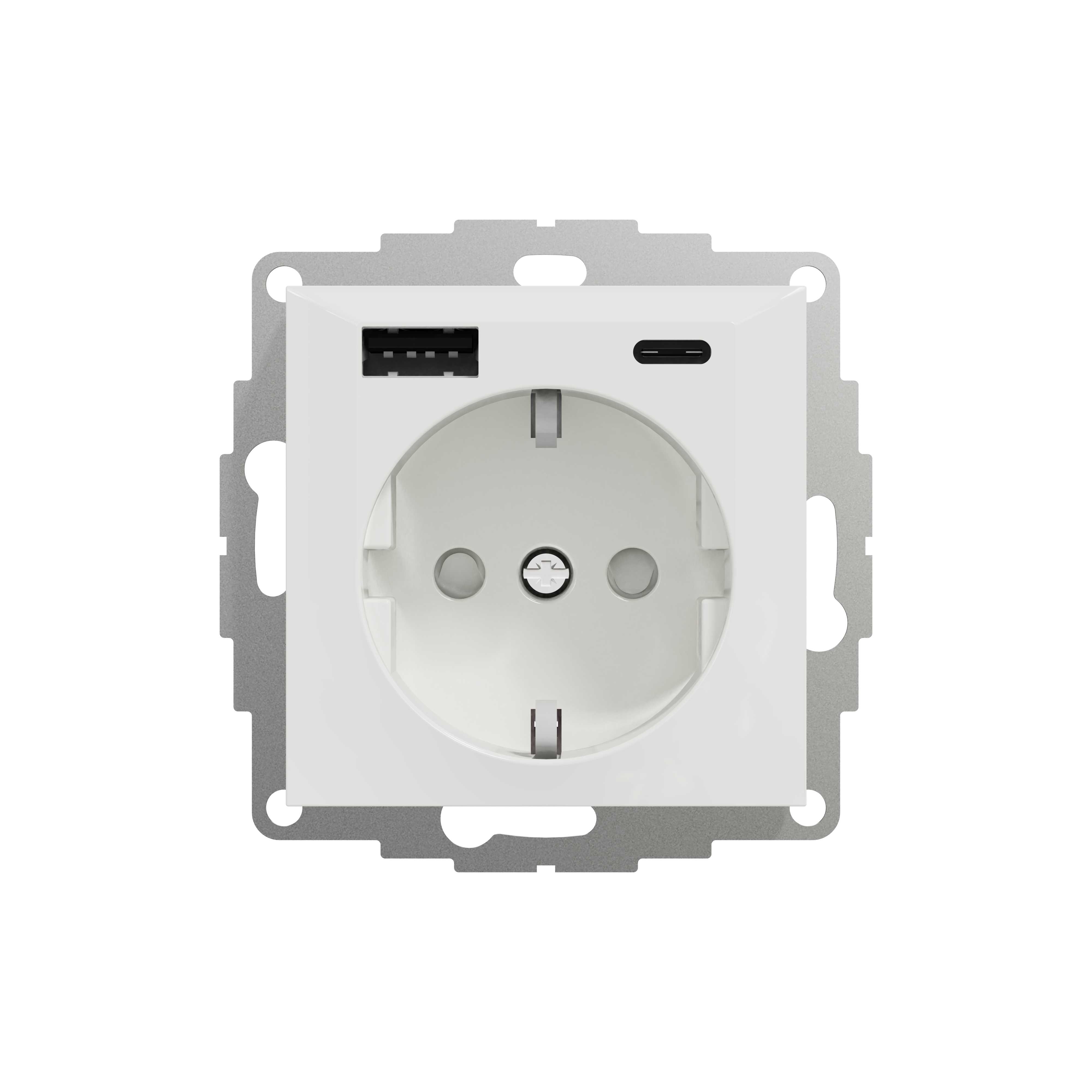 Kombinert USB A+C ladeuttak og enkel stikkontakt med jord. USB laderen yter maksimalt 3A USB-C og 2,4A USB-A. Ved bruk av begge ladeportene fordeles den maksimale ladestrømmen på begge uttakene. Laderen har elektronisk overbelastningsvern og isolasjonsklasse III. Passer inn i standard veggboks, og i alle ELKO Plus og ELKO Plus OPTION rammer. Hurtigkobling for tilkobling av begge faser + jord.