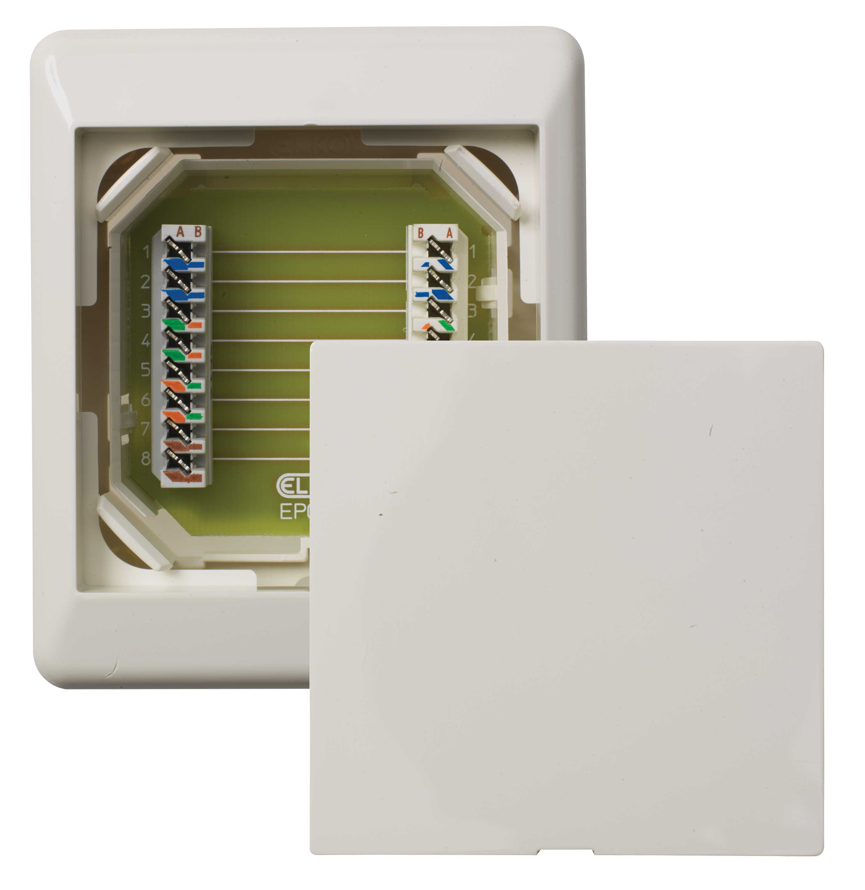 Modular koblingsboks for 4 par, for svakstrøm, tele, data og alarmsystemer for påveggmontering. Fungerer som skjøteboks for uskjermet Kat.5 og Kat.6. Kan leveres med alarm og skillebryter. (69 411 99-P/69 411 17-I). Koblingsboks leveres med LSA+ terminering med fargekode T568A/B.