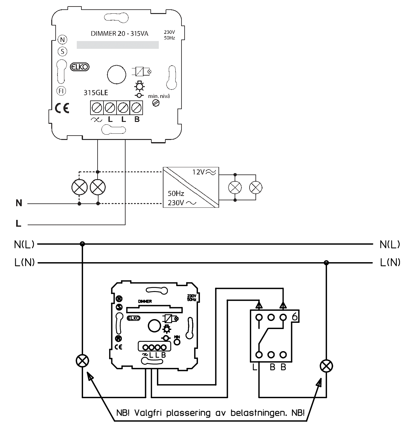 NB! Dimmeren kobler 100% ut ved overbelastning. Deretter må feilen rettes og dimmeren slås av før den igjen kan fungere som normalt.