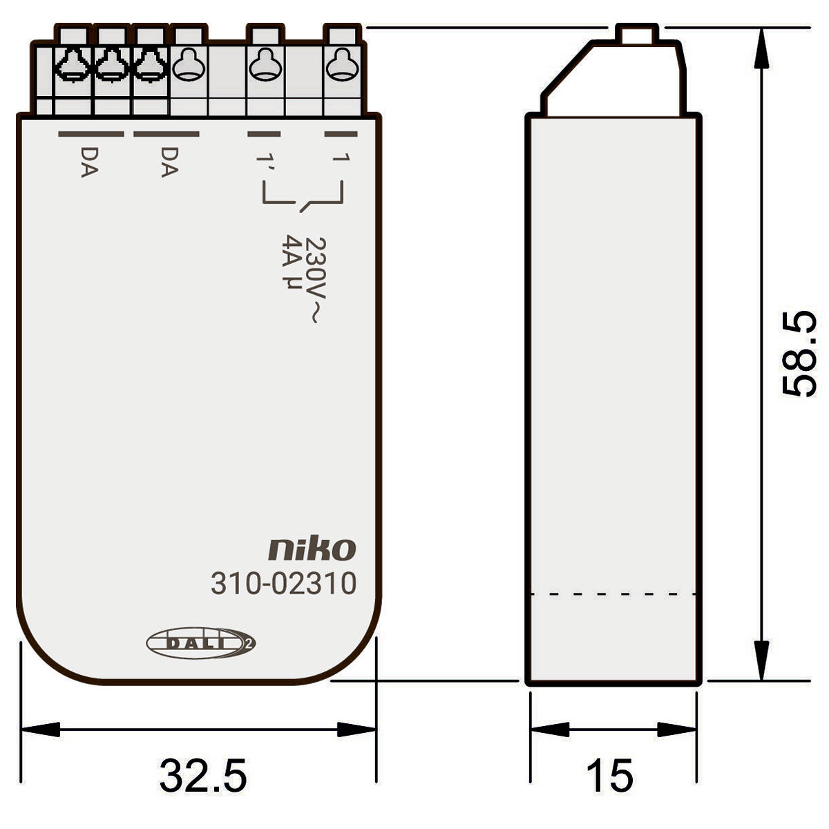 Maksimal brytestrøm for relèmodulen er 4 A. Levetiden til den integrerte relèkontakten er forlenget ved nullkryss-bryteteknologi. Relemodulen oppfyller DALI-kravene ihht. IEC 62386 deleene 102 (control-gear) og 208 (DALI-devicestype 7). DALI-adressering og konfigurasjon gjøres via Niko Detector Tool-appen. DALI-relèmodulen er direkte koblet til og strømforsynt av DALI-bussen. Merk at en separat DALI-strømforsyning er påkrevd. Relèmodulen egner seg for innbygging og skjult montasje. Sjekk dimensjonene til produktet før du velger monteringsboks.