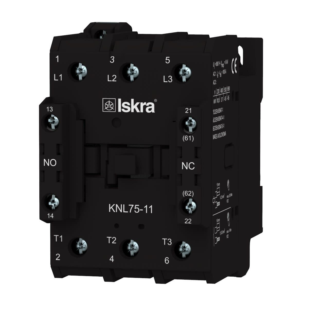 KNL-75 leveres som en 3-polt kontaktor med maks 85A last, spolespenning 230V samt hjelpekontakter 1NO/1NC. Kontaktor er i kapslingsklasse IP20 med bredde 65mm og vekt 930gr.