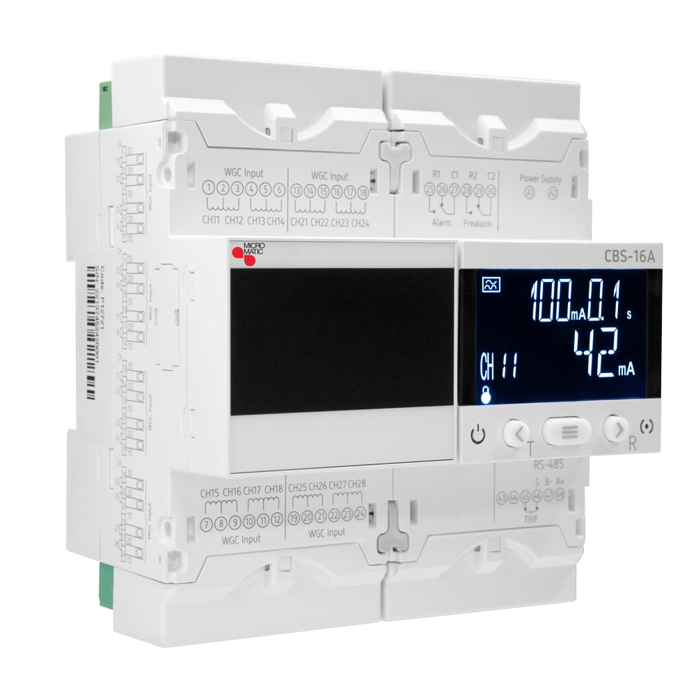 CBS-16A er en 16-kanals jordfeilskanner Type A, for skinnemontering 6 moduler. CBS-16A har digitalt display og leveres med alarm og pre-alarm-utganger samt kommunikasjon via RS485 Modbus. CBS-16A brukes sammen med summasjonstrafoer i WGC/WGS-serien som velges etter ønsket lysåpning og strømmer.