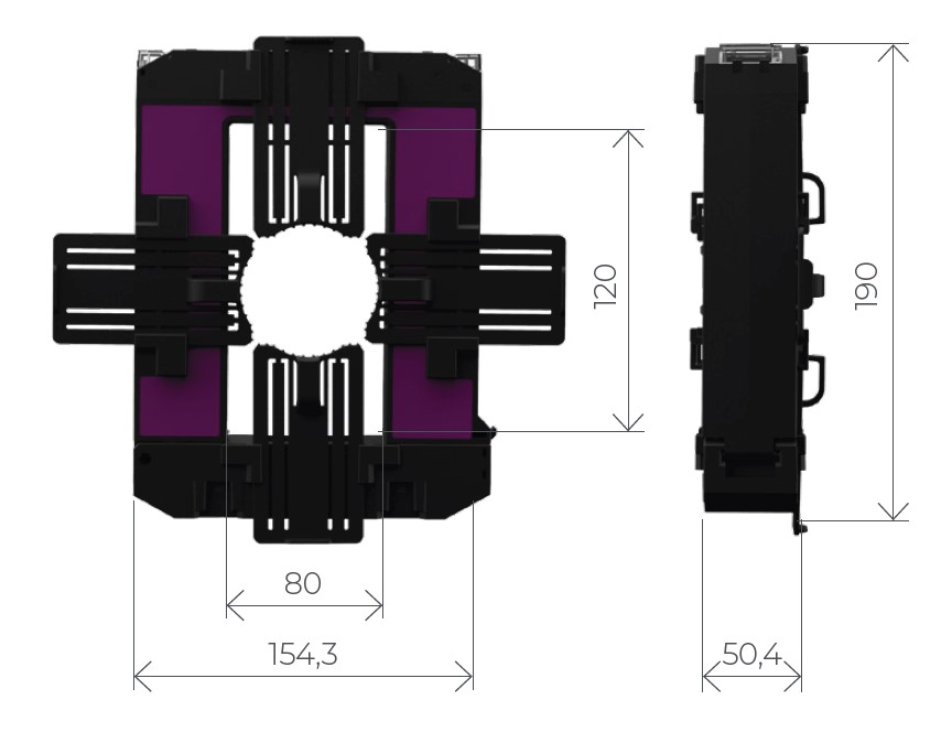 Med en lysåpning på 80×120 mm kan TP-Push812 enkelt monteres rundt samleskinne eller kabel. Den delbare konstruksjonen gjør at transformatoren kan skilles helt ved behov, noe som gir en rask og effektiv installasjon. Transformatoren klikkes raskt og sikkert sammen, medfølgende feste muliggjør montering på bunnplate, DIN-skinne eller direkte på skinne/kabel.