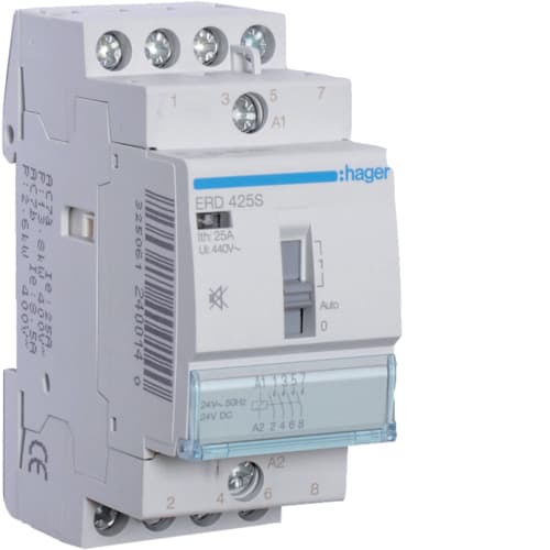 Hager - Modulær kontaktor, 1-mod, brumfri, bryter i front, 2x25A, 24VAC - ERD225S
