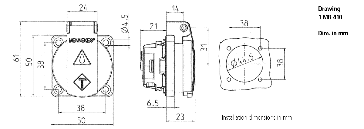 Mennekes - 11031,Panelmontert Uttak Schuko, 230V, 16A, IP54 blå - 11031