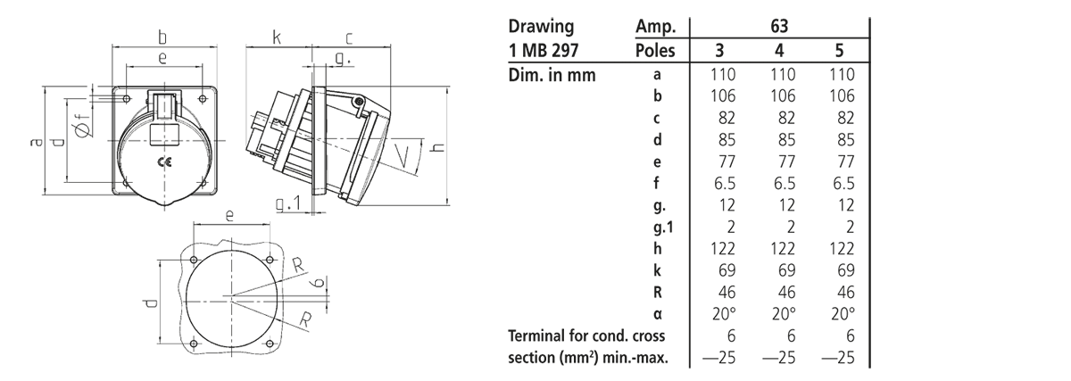 Mennekes - 1155A,63A5P 6H400V Panelmontert uttak IP44 med X-contact - 78469