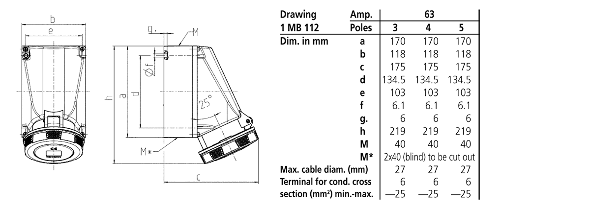 Mennekes - 136A,63A5P 6H400V Veggmonter apparat Uttak IP67 med X-contact - 136A