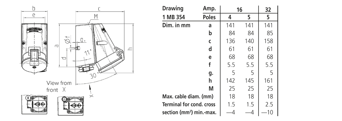 Mennekes - 1647,16A4P 9H230V Veggmontert apparat Uttak med Schuko IP44 - 76547
