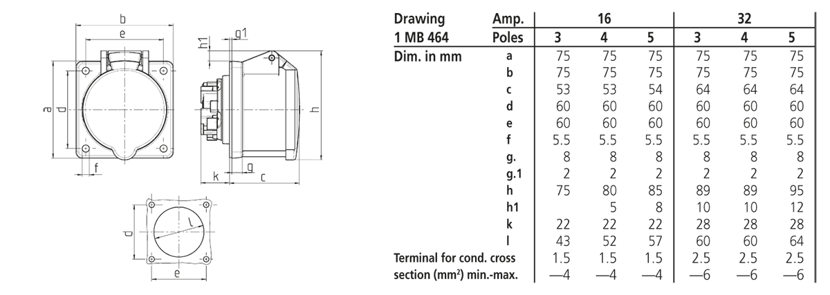 Mennekes - 1668,16A3p6h 230V Panelmontert apparat Uttak IP44 med skrueløs tilkoblingsteknikk - 1668