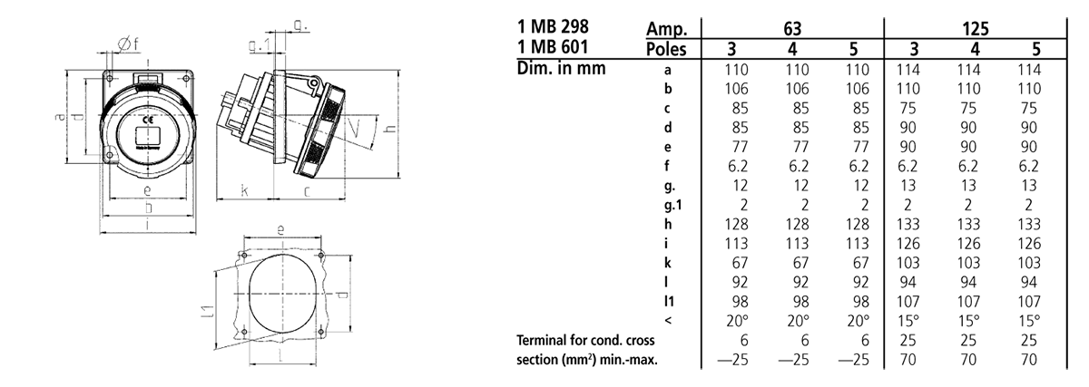 Mennekes - 212A,125A4P 6H400V Panlemontert apparat uttak IP67 - 212A