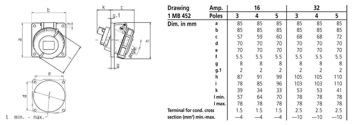 Mennekes - 3524,32A5P 6H400V Panelmonter uttak IP 67 FL. 85 x 85 mm BH. 70 x 70 mm - 3524