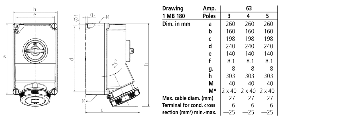 Mennekes - 5109A,63A4p9h 230V Veggmontert Uttak DUO Block IP67 med X-contact - 78671