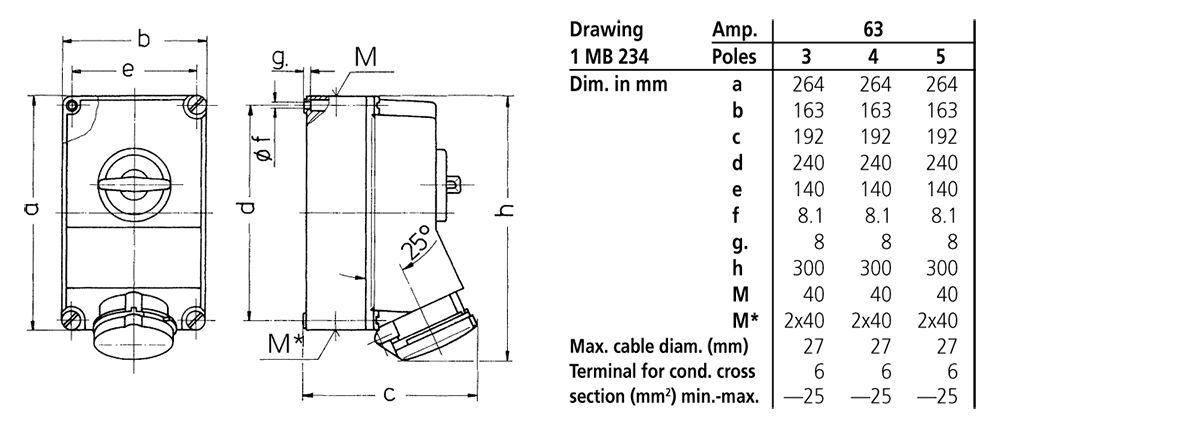 Mennekes - 5955A,63A4p9h 230V Veggmontert Uttak DUO Block IP44 med X-contact - 78746