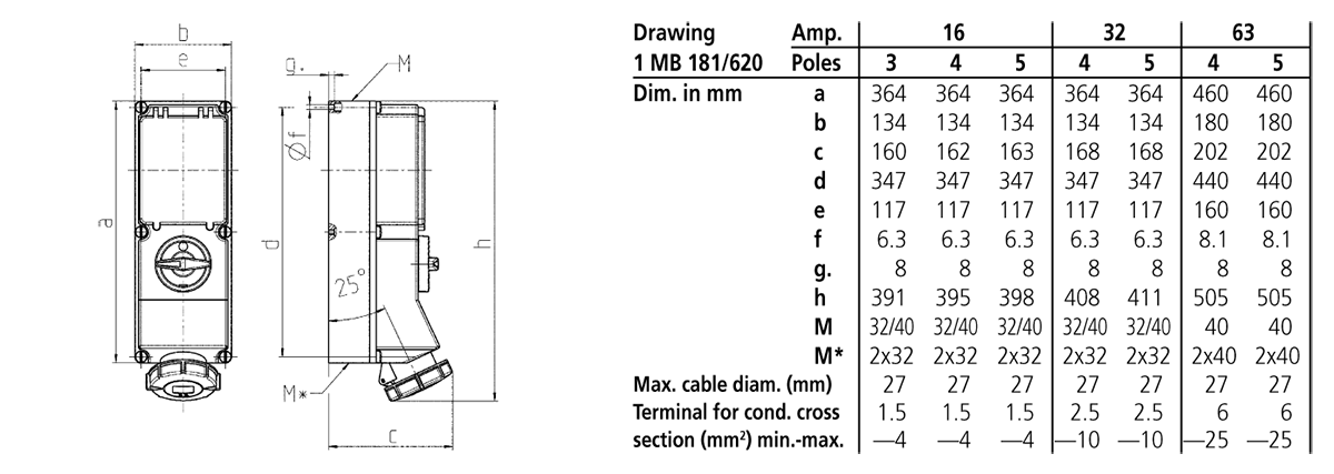 Mennekes - 7247,16A5p6h 400V Veggmontert Uttak DUO Block IP67 med Jordfeilbryter 40A4P IFN 0,03A - 7247