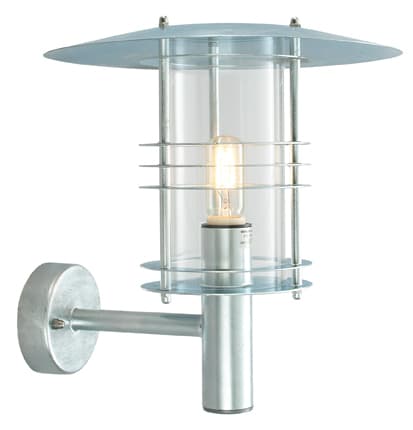Vegglampe i moderne design. Lampen er 38cm høy med en bredde på 39,5cm. Veggfeste er 11,5cm høy. Klar polykarbonat. Lampen kan festes på hjørnevegg. Hjørnefeste bestilles separat. Artikkel 153. Vegglampen leveres i fargene galvanisert stål og sort. Lampen er en del av en serie som inneholder en mindre utgave av vegglampen, portstolpe, blomsterstolpe, teleskopstolper med 1 til 3 lyktehoder, samt pullerter ulike varianter og høyder.