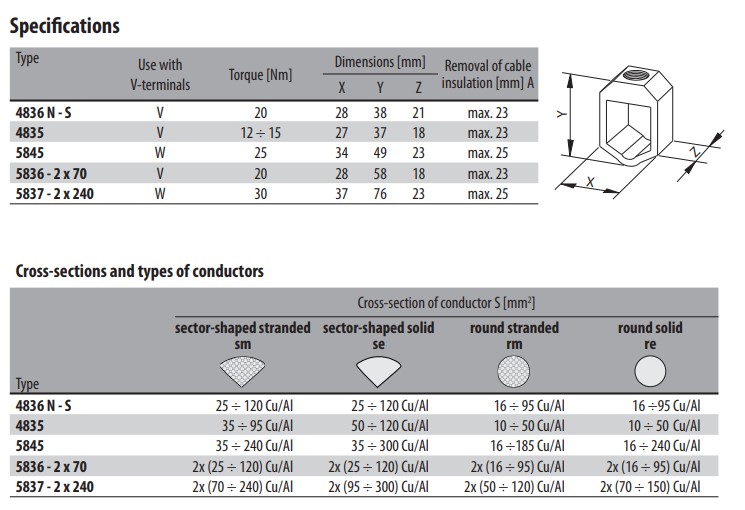 5845 N-S V-formet klemme 35 ÷ 240 Cu/Al 35 ÷ 300 Cu/Al 16 ÷185 Cu/Al 16 ÷ 240 Cu/Al